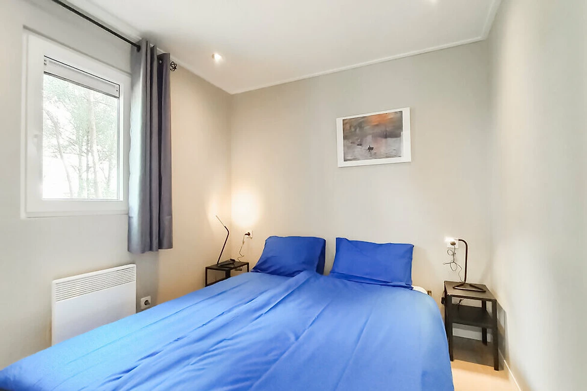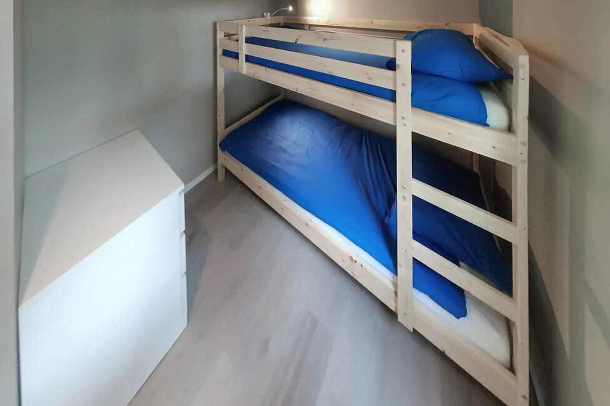 Er zijn twee slaapkamers, een met een tweepersoons bed 200 x 160, de andere kamer heeft een stapelbed. Beide kamers hebben een linnenkast, de kamer met het stapelbed heeft ook een een ladenkastje. De slaapkamers zijn - evenals de badkamer - voorzien van vliegenhorren. De badkamer beschikt over een (wand)toilet, wastafelmeubel, ruime inloopdouche, designradiator en een insectenhor.
