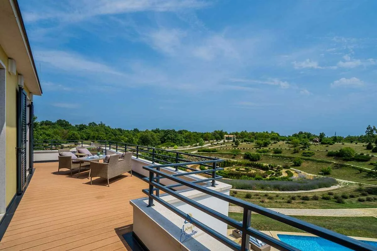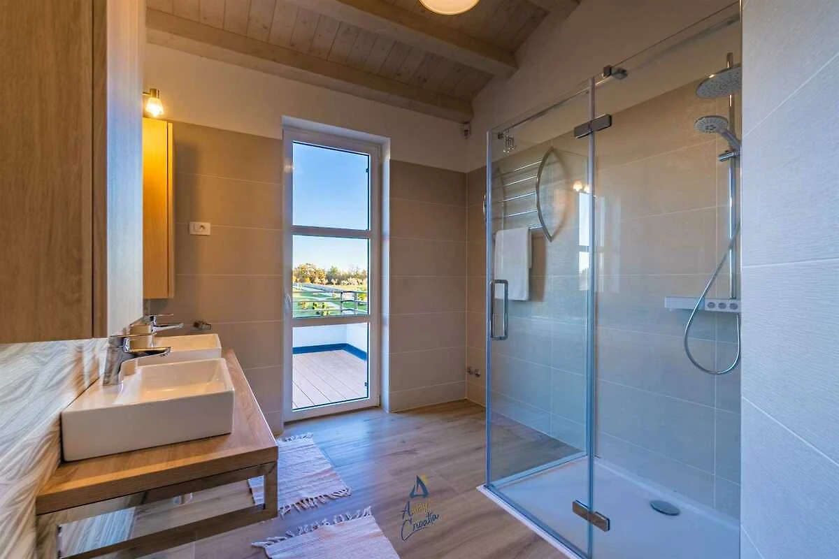 Villa Arkaim is een uniek gebouw in het pittoreske Istrische dorpje Filipana (Marčana), dat elegantie en comfort uitstraalt en het hele jaar door te huur is, op slechts 37 km van Poreč. Er zijn veel kenmerken die de villa uniek maken, en dat is zeker het park eromheen, met een oppervlakte van 23.468 m² en aangelegd volgens feng shui-principes . Naast de bloementuinen , olijfbomen en mediterrane begroeiing zijn er talloze privéwandelpaden speciaal voor u aangelegd. De villa ligt vlakbij vele startpunten voor wandelen, fietsen, paardrijden of zwemmen op rustige, ongerepte stranden. Villa ARKAIM biedt accommodatie voor maximaal 10 personen, met een seizoensgebonden buitenzwembad , een tuin en barbecuefaciliteiten . Er zijn 5 slaapkamers , gratis wifi en uitzicht op het zwembad. Eén slaapkamer met een aparte badkamer is aangepast voor mensen met een beperking . Dankzij het decoratieconcept is er gemakkelijke toegang tot de begane grond en het terras, evenals toegang tot het zwembad en de tuin. Er is ook een hydraulisch bed aanwezig. Naast vakantieverhuur is deze locatie ook uitermate geschikt voor zakelijke doeleinden (workshops, seminars), groepsbijeenkomsten, bruiloften of foto- en video-opnames. Huisdieren zijn toegestaan op aanvraag en tegen een toeslag van 50 euro/hond/week. Voor het verwarmen van het zwembad geldt een toeslag van 200 EUR per week, te betalen bij aankomst.