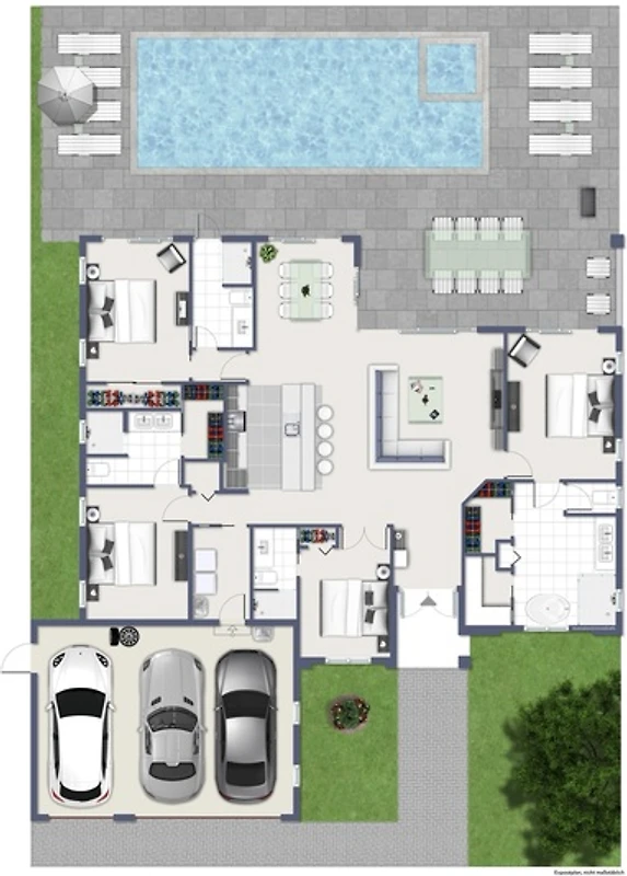 Het hart van de villa is het buitengedeelte: Het grote zoutwaterzwembad is elektrisch verwarmbaar en wordt met een zoutinstallatie bediend, wat het water zeer aangenaam en huidvriendelijk maakt. In principe is het een zoetwaterzwembad zonder chloor. U heeft gegarandeerd geen geïrriteerde ogen meer. Omgeven door ligstoelen, een BBQ-grill, een buitendouche en een whirlpool wordt het terras de ultieme plek voor zonnige dagen en zwoele, magische avonden. Onder het overdekte terras nodigt een grote eettafel uit om samen te genieten en te feesten – perfect voor onvergetelijke momenten met familie of vrienden. Een zwembadhek voor de veiligheid van de kinderen is ook aanwezig.