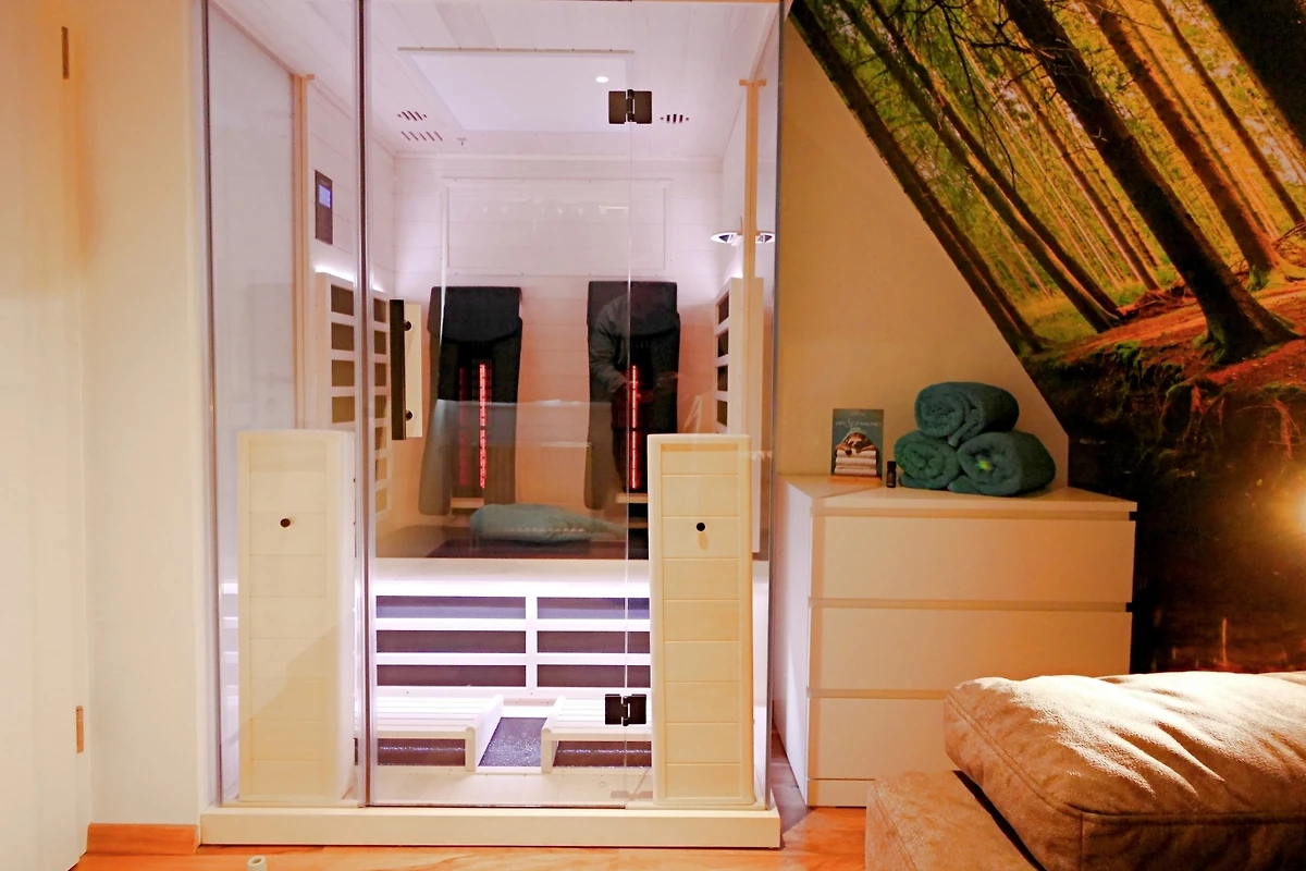 - flexibel relaxkamer met 2-persoons infraroodsauna, relaxbank en tv. De bank is om te bouwen tot slaapplaats voor extra personen 5-6.