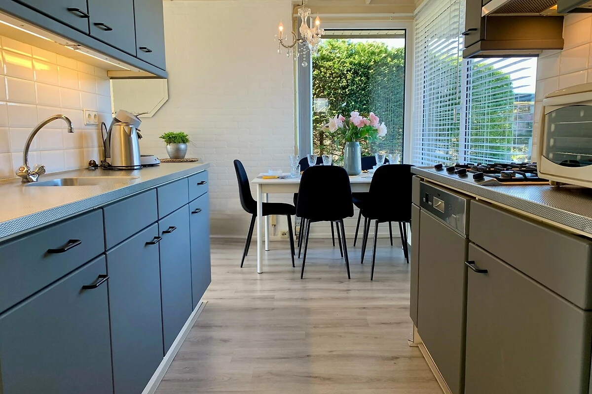 Open keuken met eethoek, vaatwasmachine, gasfornuis en een elektrische oven, koelkast met vriesvak, Senseo koffiezetapparaat, waterkoker en broodrooster