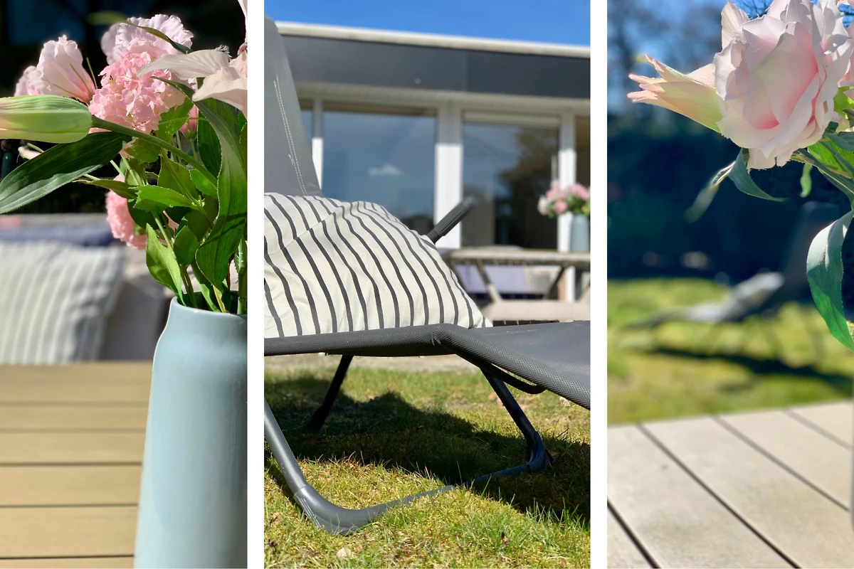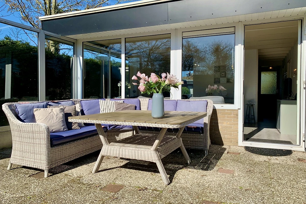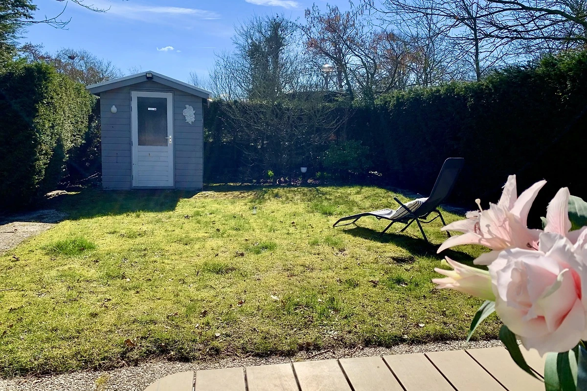 De volledig omheinde tuin met gazon en terras bevindt zich op het zuiden. Er is divers tuinmeubilair aanwezig waaronder een tuintafel met stoelen, ligbedden en een loungebank. Een parasol biedt schaduw op de zonnige en warme dagen.