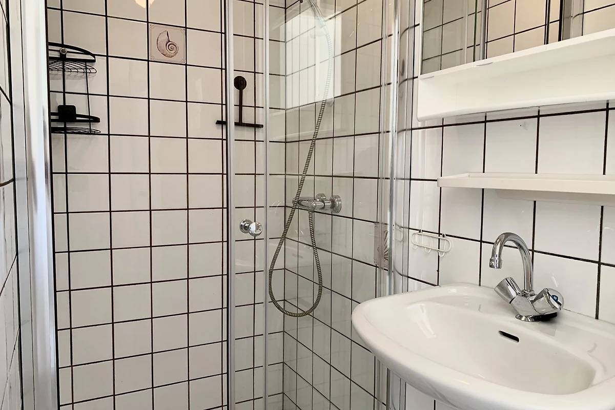Badkamer met douchecabine, wastafel met spiegel. Het toilet is apart.