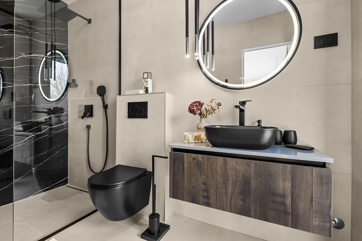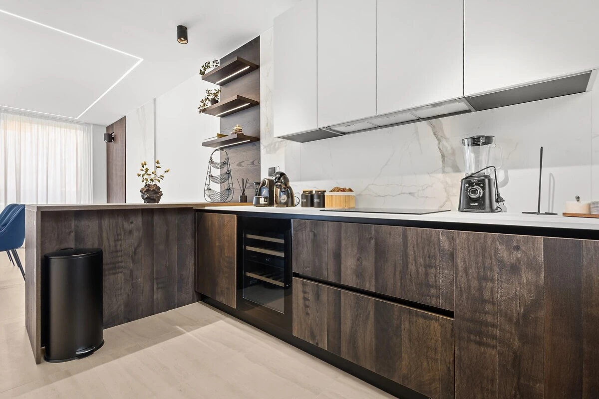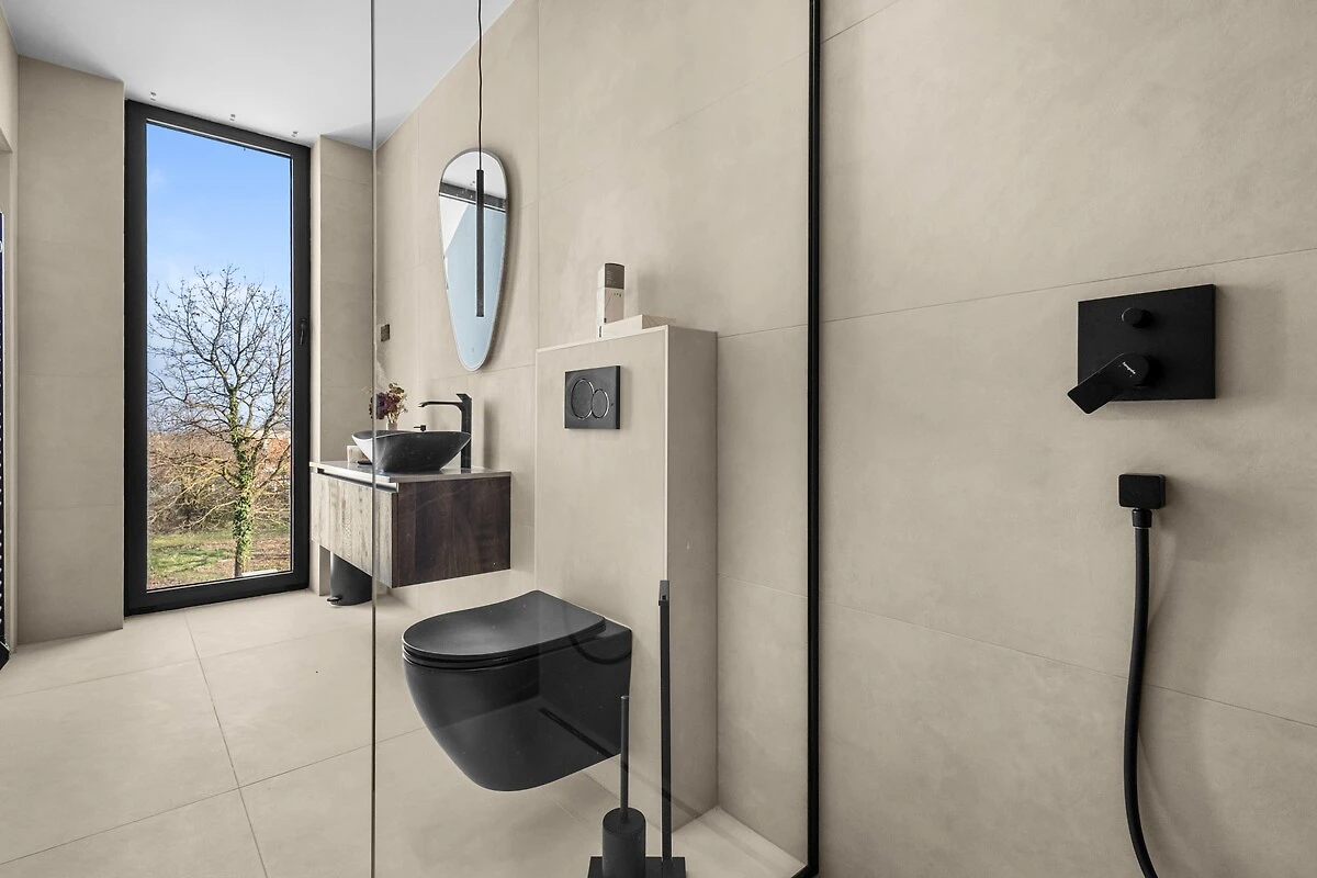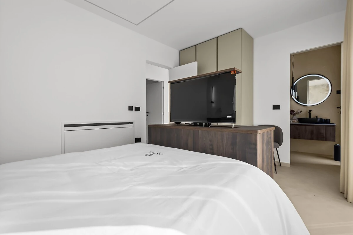 Op de begane grond bevindt zich een moderne, open woonruimte die verbonden is met een volledig uitgeruste keuken en een eetgedeelte, evenals een gastentoilet. De ruimte is licht, luchtig en verbonden met het buitenterras. Een bijzonder detail is de tv, die uit een kast tevoorschijn komt en bij behoefte weer verdwijnt, wat de ruimte een modern en interessant karakter geeft.
