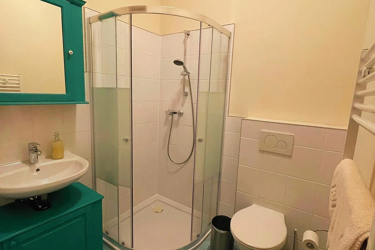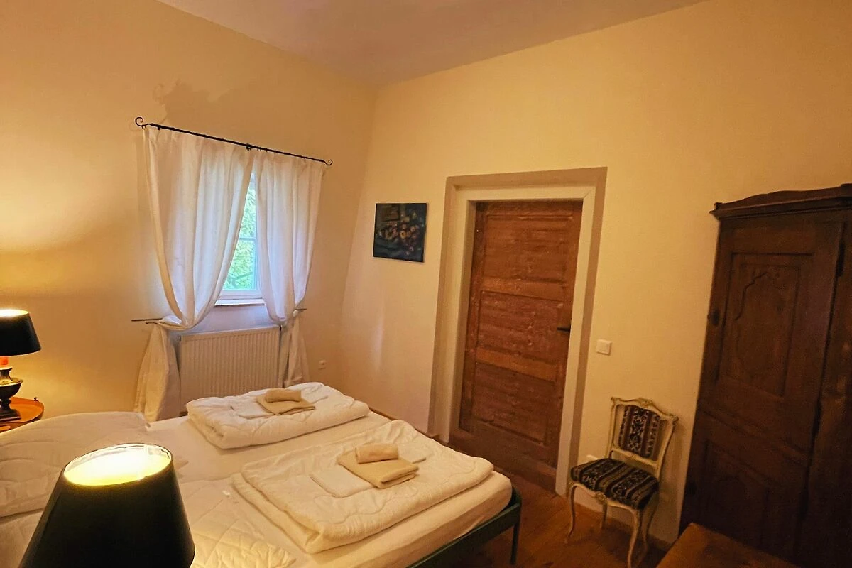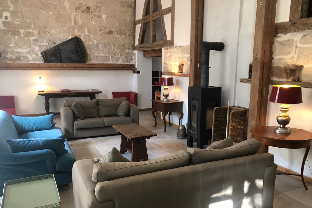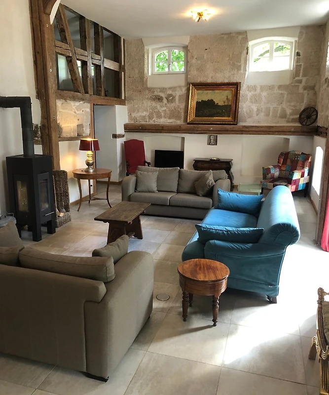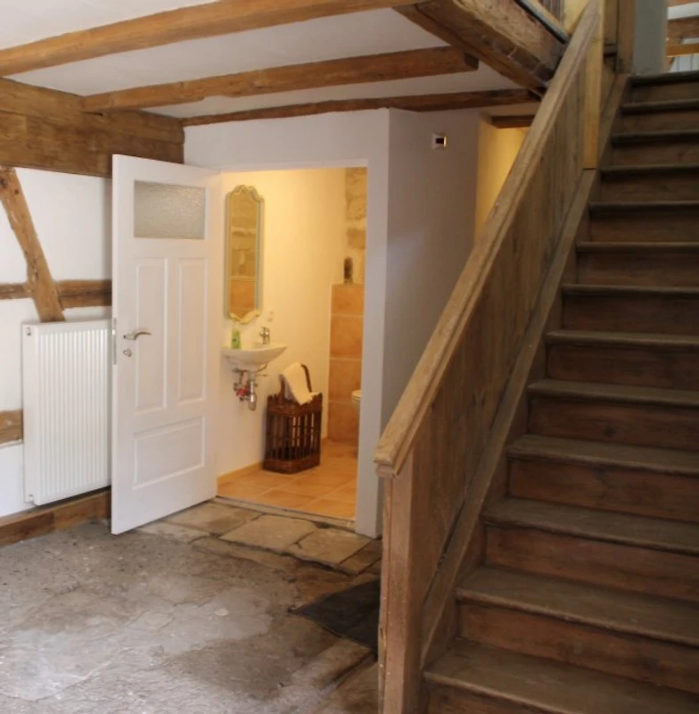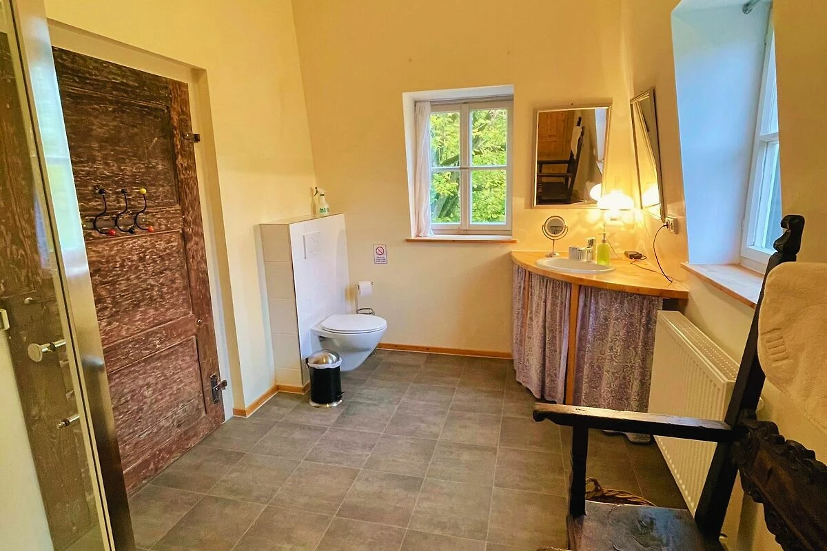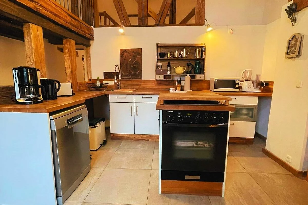 We hebben ons er helemaal op ons gemak gevoeld. De ambiance is prachtig: weilanden, heuvels, bomen, een beek, de uitgestrekte binnenplaats van het kasteelcomplex, tuinen en bloemen. De oude wagenmakerij is met veel liefde en slimme ideeën helemaal vernieuwd en biedt comfortabel plaats aan 12 personen in twee- en driepersoonskamers. Een uitstekend uitgeruste keuken biedt ook veeleisende koks alle mogelijkheden, bovendien is de servieskast rijk gevuld, er ontbreekt niets. Om de zware houten eettafel kunnen zich allen verzamelen, evenals om de tafels in de binnenplaats en de tuin. Gezellig kan men zich laten vallen in de sofa's, die in het midden van de hoge woonkamer een cirkel vormen.