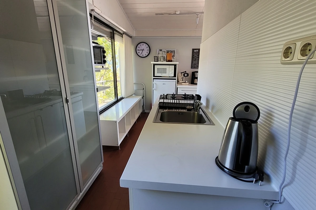 Het driezijdige, deels overdekte terras met prachtig uitzicht op Tignale, de Monte Baldo, de westelijke oever van het Gardameer en op heldere dagen zelfs tot aan de zuidoever van het meer, maakt de bungalow tot een perfecte plek om tot rust te komen. 2 trappen met in totaal ca. 20 treden... leiden naar een van de mooiste uitzichten op het meer van het vakantiepark. Ons terras is door de verhoogde ligging niet zichtbaar vanaf de straat. Door de hagen naar de aangrenzende percelen blijft u ongestoord voor nieuwsgierige blikken.