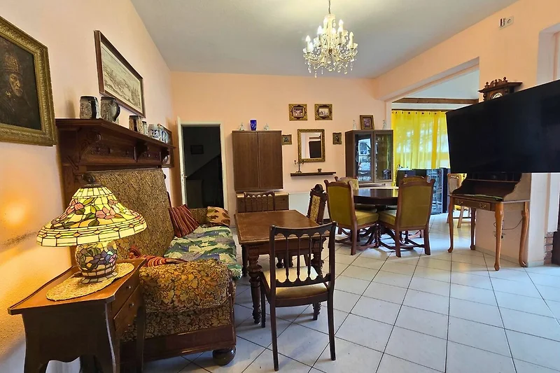 Het vakantiehuis heeft een terras, woonkamer-wintertuin, hal, Amerikaanse keuken, 7 slaapkamers en 3 badkamers. Op het terras en in de tuin staan 18 stoelen, 3 tafels en 2 barbecues. In de woonkamer-wintertuin staan 5 eettafels met 22 stoelen, 1 bank en 4 gestoffeerde stoelen en een 65 inch 3D-tv. Het is overstroomd met licht en de panoramische ramen kijken uit op het zuiden. Het uitzicht op het meer wordt omlijst door veel groen. Schoenen en jassen kunnen in de gang worden opgeborgen. De "Amerikaanse inbouwkeuken" is uitgerust met vaatwasser, 4-pits keramische kookplaat met oven, magnetron, waterkoker, broodrooster, koffiezetapparaat en alle kookgerei. De eerste doucheruimte op de begane grond bestaat uit een wastafel, WC en ronde douche. De badkamer op de begane grond heeft 1 wastafel, een verhoogd toilet en een inloopdouche en is daarom geschikt voor rolstoelgebruikers. De twee slaapkamers op de begane grond hebben elk 1 tweepersoonsbed en 1 eenpersoonsbed, nachtkastjes, spiegel en 1 kledingkast. De voorste slaapkamer rechts heeft ook een LED TV. Vanuit de woonkamer bereikt u via een klein halletje de bovenverdieping met zijn 5 slaapkamers. Beneden in de gang staan 2 koelkasten, rekken en veel ruimte voor de boodschappen. Een van de twee koelkasten is een grote SIDE-by-SIDE-KS. Boven is de badkamer met WC, wastafel en ronde douche. De 5 slaapkamers op de bovenverdieping hebben elk kledingkasten en nachtkastjes en zijn uitgerust met : "slaapkamer" met 1 tweepersoonsbed, : 1 hoogslaper en 1 eenpersoonsbed, : 2 boxspringbedden en LED-TV, 2 boxspringbedden en LED-TV, : 1 tweepersoonsbed en 2 eenpersoonsbedden.