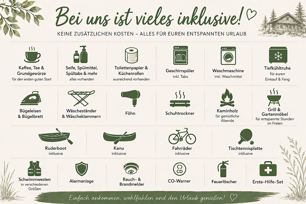 In de prijs inbegrepen zijn vier fietsen (3 x 28”, 1 x 26”), een roeiboot, een kano met reddingsvesten, evenals een tafeltennistafel, een trampoline en snel internet.