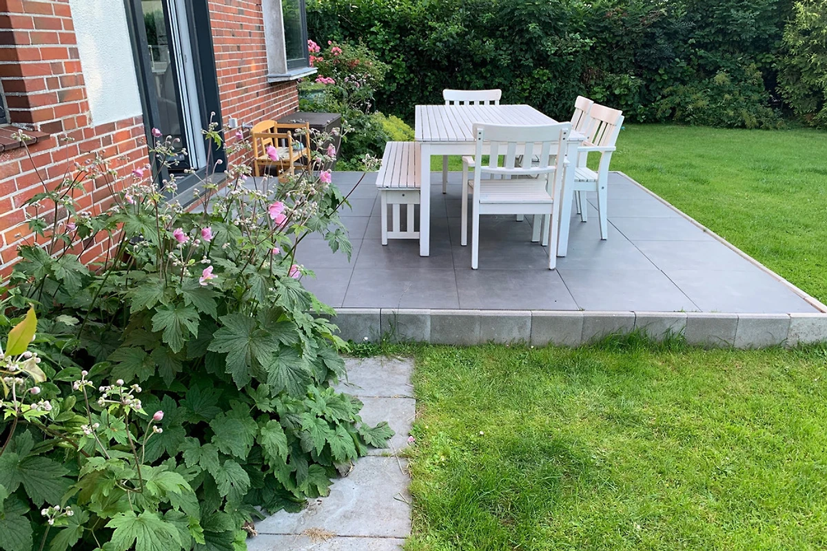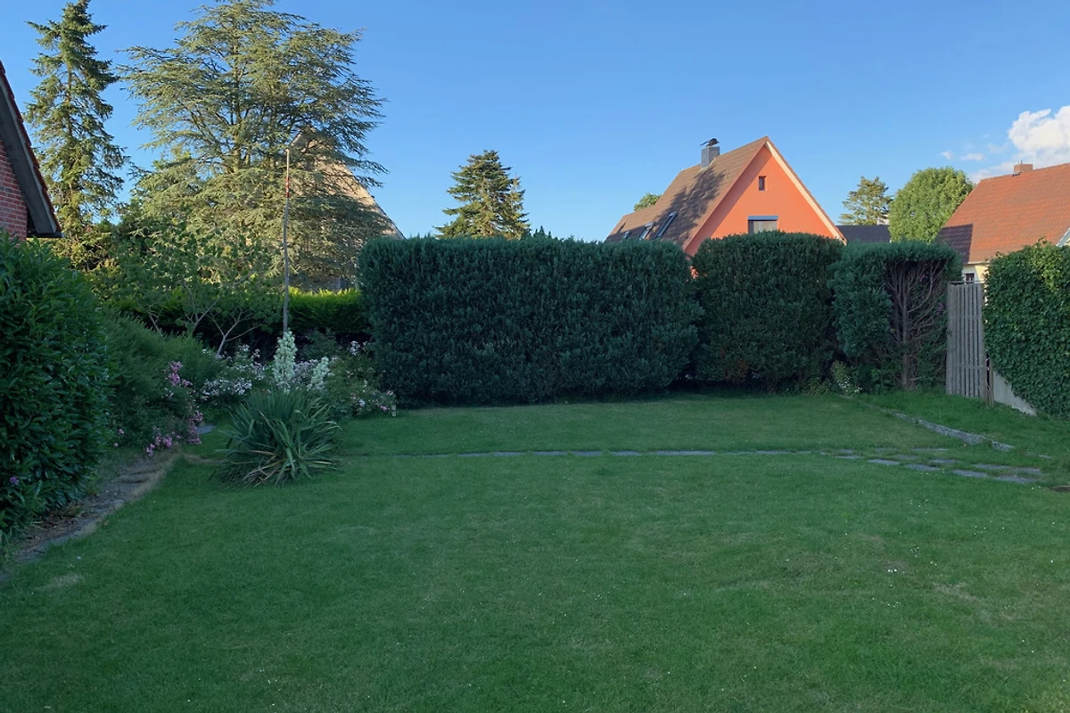 De tuin is erg groot. Er is een terras met zitplaatsen om buiten te eten, direct grenzend aan de keuken.