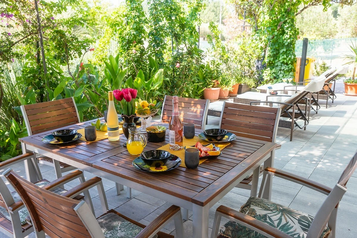 Het appartement bevindt zich op de begane grond van het familiehuis met een eigen ingang op een terrein van 1000m2. Het bestaat uit 2 slaapkamers, 2 badkamers, een woonkamer, een keuken met eethoek, een berging en een groot terras. Twee ruime slaapkamers met tweepersoonsbedden hebben airconditioning, kingsize boxspringbedden (2x180cmx200cm), een werkhoek en een charmant uitzicht op de tuin. Eén slaapkamer heeft een balkon dat perfect is om 's ochtends koffie te drinken omringd door de geuren van het Middellandse Zeegebied. Twee moderne badkamers hebben douches, haardrogers. Een van de badkamers is uitgerust met een wasmachine. De comfortabele woonkamer heeft een grote zitbank (kan ook als slaapbank gebruikt worden) en een 55'' SMART LCD-TV en een Play Station 3. De moderne keuken met eetgedeelte is goed uitgerust met twee koelkasten, een elektrische oven, een magnetron, een koffiezetapparaat, een waterkoker, een broodrooster. Stap het appartement uit naar je charmante 50m2 grote buitenpatio (terras) met tuinmeubilair en ligstoelen, omgeven door rozemarijn, lavendel, citroenen en laurierbomen. Het appartement biedt gratis WI-FI internet, twee parkeerplaatsen, katoenen beddengoed, badhanddoeken, toiletartikelen en een milieuvriendelijke boodschappentas. Gasten kunnen gebruik maken van twee BBQ-voorzieningen (hout of houtskool): gedeelde BBQ-ruimte in de binnenplaats van het huis of speciale BBQ-huis in het 150 jaar oude Dalmatische stenen huisje in de nabijgelegen olijfgaard. Hier kun je de unieke Dalmatische sfeer ervaren terwijl je samen met familie of vrienden eigen maaltijden bereidt.