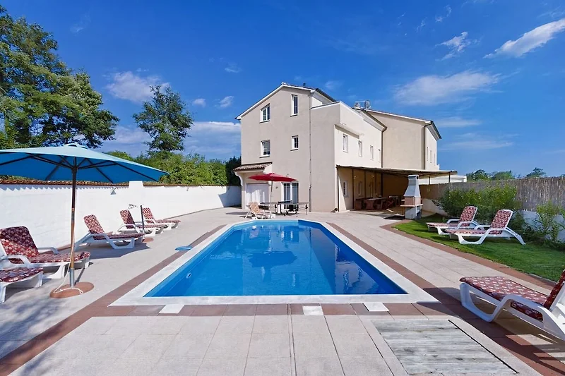Prachtige vakantievilla midden in het schilderachtige landschap van het binnenland van Istrië. Het huis biedt voldoende ruimte voor meerdere gezinnen of vriendengroepen die samen de vakantie willen doorbrengen. Het is nieuw en modern ingericht en de uitgebreide faciliteiten bieden het comfort dat u nodig heeft voor uw vakantie. Op de begane grond bevinden zich een grote keuken, woonkamer en 4 slaapkamers, waarvan één geschikt voor mindervaliden (rolstoeltoegankelijk, eventueel voorzien van een elektrisch verpleegbed, dat wij kosteloos ter beschikking stellen). Op de eerste verdieping zijn er nog 6 tweepersoonskamers en een extra eenpersoonskamer. Elke slaapkamer met badkamer (douche/toilet), waarvan één met hoekbad, biedt pure luxe. Op het prachtig aangelegde en omheinde terrein nodigt een zwembad van 36 m² met buitendouche uit om af te koelen. Tevens is er op het terras een grote koelcel van 5 m² aanwezig zodat u voldoende ruimte heeft om uw drankjes en etenswaren te koelen. In de tuin bevindt zich ook een steengrill waar u heerlijke gerechten op de grill kunt bereiden en ervan kunt genieten in een ontspannen sfeer en een natuurlijke omgeving.