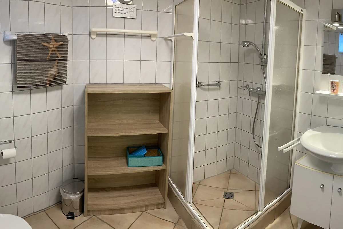 Eerste badkamer met douche, toilet, wastafel, opslag plank, haardroger en handdoekhouders (meer dan 12).