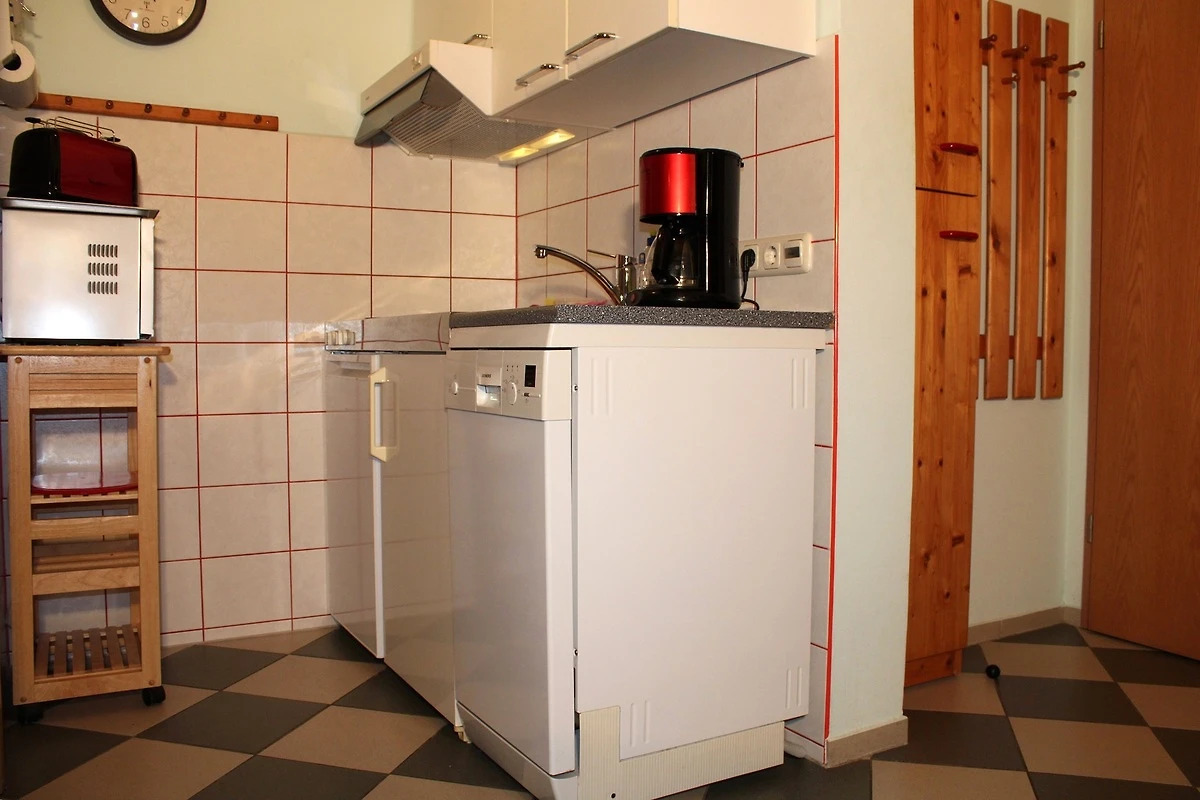 In het woon- en keukengedeelte vindt u een kitchenette met gootsteen, koelkast met vriesvak, vaatwasser, koffiezetapparaat, waterkoker, magnetron en broodrooster. Het is volledig uitgerust met serviesgoed, potten en bestek.