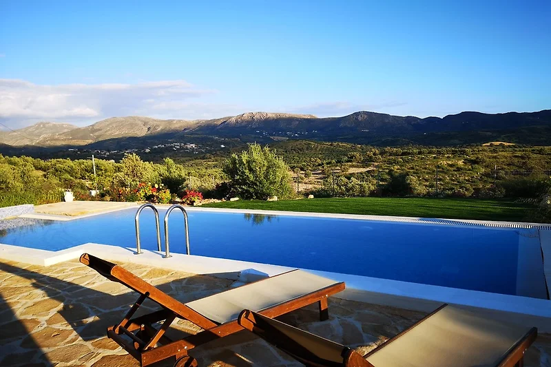 De verhuurders, Maria en Xenophon, deden er alles aan om ervoor te zorgen dat we een zo goed mogelijk verblijf hadden. We werden vriendelijk ontvangen met een geweldige verfrissing. Het huis was super schoon, het zwembad werd permanent schoongemaakt, alles was top. Vooral het grote zwembad is een echte droom. Omdat het wateroppervlak vlak bij het terrein eindigt, heeft men zelfs tijdens het zwemmen een geniaal uitzicht op de omliggende bergen.