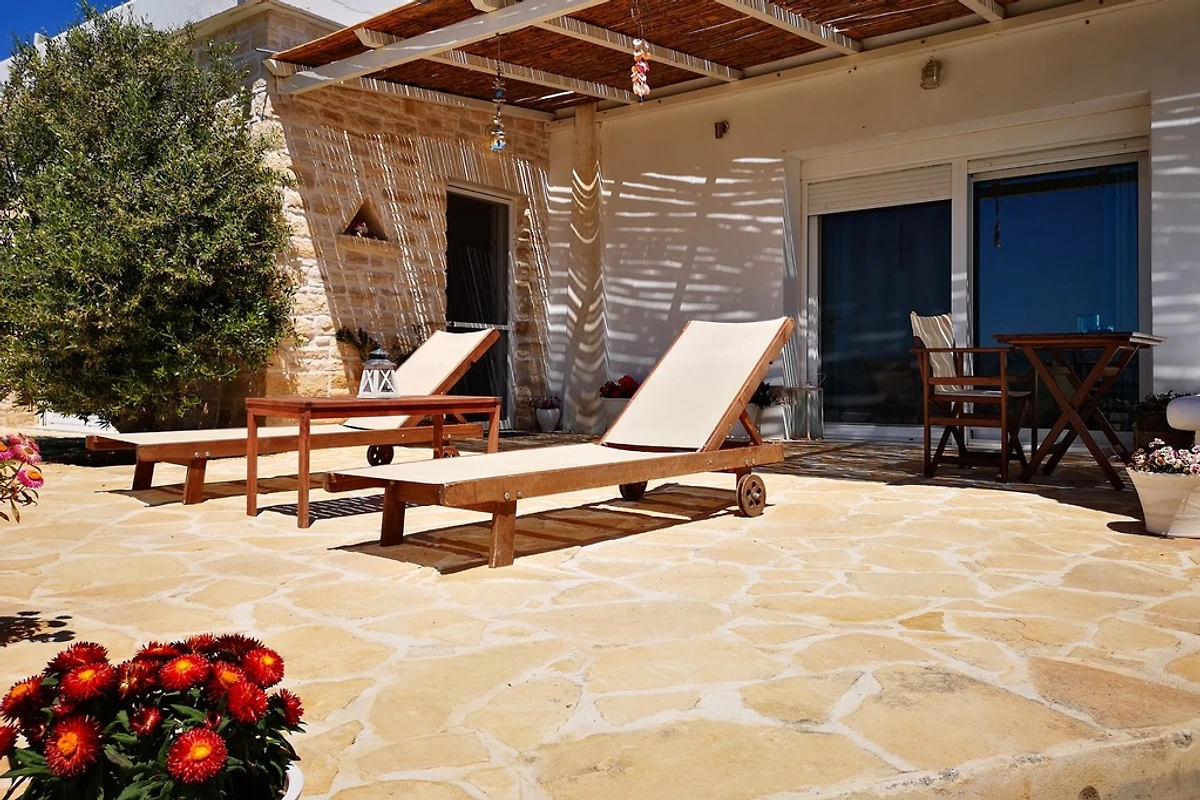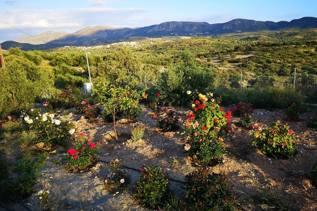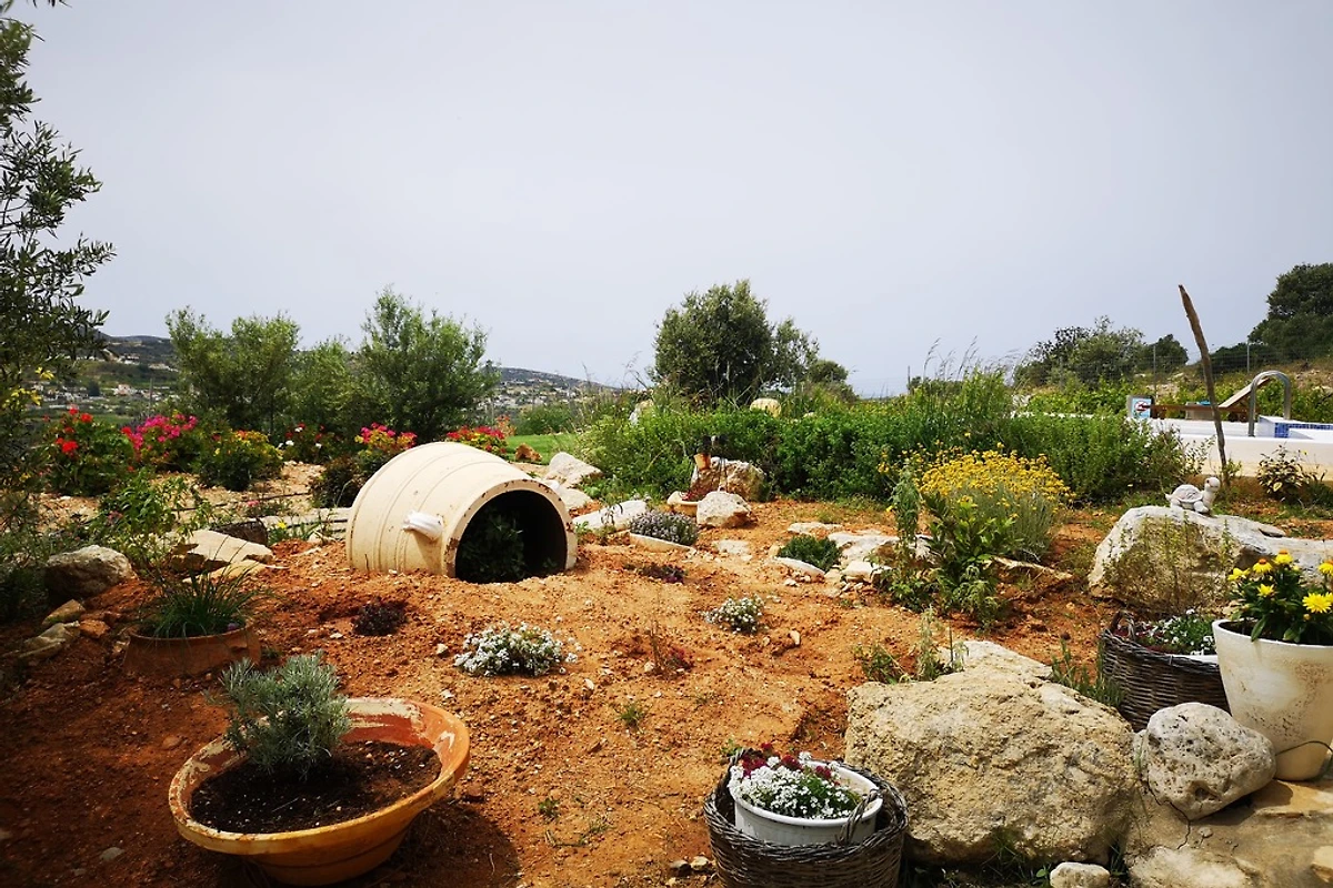 Vanaf de terrassen heb je een prachtig uitzicht over het natuurlijke landschap tot aan de zee. De grote tuin met tuinmeubilair biedt rust en ontspanning. Je zult graag eten op het buitenterras terwijl je geniet van het prachtige uitzicht op de nabijgelegen dorpen, de vruchtbare vlakte van Messara en de Libische Zee. Onder het huis vind je fruitbomen, kruiden, een cactustuin en een biologische tuin. Afgezien van het gezang van de vogels, de wind en de krekels, hoor je alleen maar stilte... Als je op zoek bent naar rust en stilte, als een paar leuke taverna's en het rustige Kretenzische dorpsleven genoeg zijn, zul je je thuis voelen in Kamilari. Het dorp heeft een supermarkt met slagerij, 1-2 minimarktjes, verschillende taverna's en kafenions. De stranden van Kalamaki, Komo en Matala liggen op slechts een paar minuten rijden en de dorpen Mires en Timbaki, met hun markten en winkels, liggen op 15 minuten rijden.