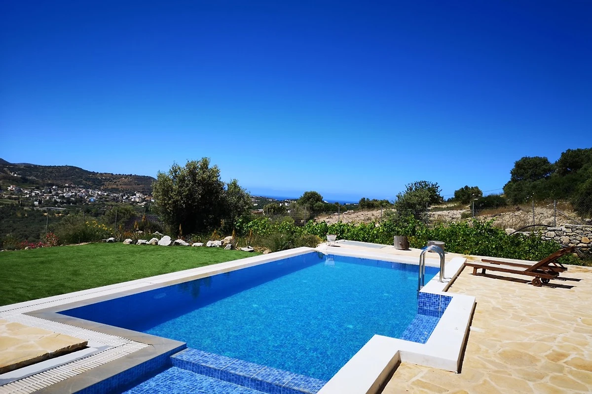 De villa ligt afgelegen, midden in de natuur, 250 meter buiten het dorp Kamilari, in een mooie, rustige omgeving met veel privacy en biedt je een adembenemend panoramisch uitzicht op olijfgaarden, de dorpen Pitsidia, Sivas en Listaros en de Libische Zee. De villa staat op een perceel van 2050m² met een goed onderhouden tuin met olijfbomen en mediterrane beplanting. In een prachtig park vol bloemen en planten bevindt zich tevens een overloopzwembad van 50 m² met hydromassage en kinderbad. De ligweide is uitgerust met ligstoelen (en strandlakens).