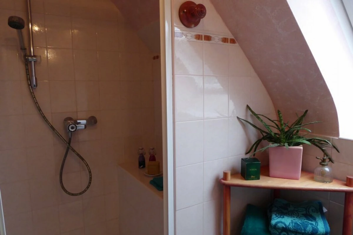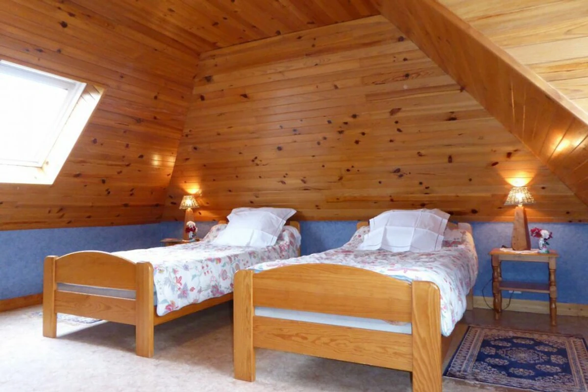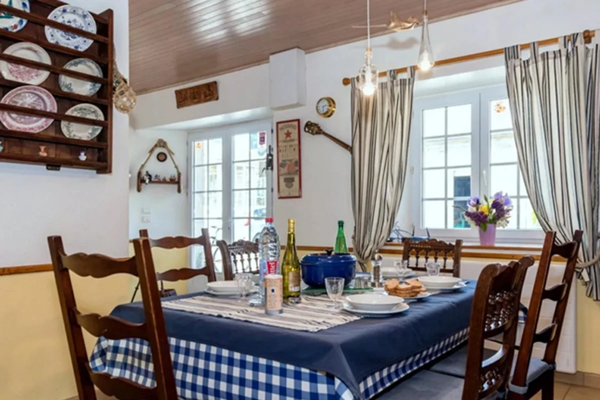 Via de binnenplaats toegang tot de hal, open naar de mooie, ruime woon-/zitkamer, beige keramische vloer, witte muren, houten plafond, grote eettafel met stoelen, bordenplank. Voor de open haard met kachel een stijlvolle, bordeauxrode zithoek, salontafel, commode, mooie schilderijen en decoraties. Mooie ingebouwde houten keuken, goed uitgerust, kleine tafel, 2 stoelen, deur naar de tuin en het terras achter het huis. 1 mooie slaapkamer, grenen meubels, pvc-vloer: 1 Frans bed (140 cm), kast. Kleine badkamer: Badkuip met douchevoorziening, wastafel. WC apart. Vanuit de woon-/zitkamer leidt een houten trap naar de verdieping. 2 smaakvol ingerichte slaapkamers, PVC-vloer, wanden, plafond en schuine delen met hout bekleed, Velux-raam, kast, commode: elk 2 bedden (90 cm). Mooie douchekamer met lichte schuine wanden: douchecabine, wastafel, Velux-raam. WC apart.