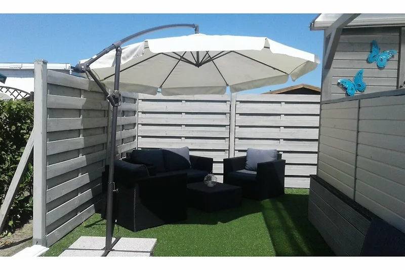 Het nieuwe buitenruimte met een overdekte houten terras, zitplaatsen en een gasgrill, nodigt uit tot gezellig samenzijn. Terwijl u ontspant in de tuinlounge in het lagere tuingedeelte, kunnen uw kinderen zorgeloos buiten spelen, aangezien het stacaravan aan het einde van een doodlopende weg is gelegen.