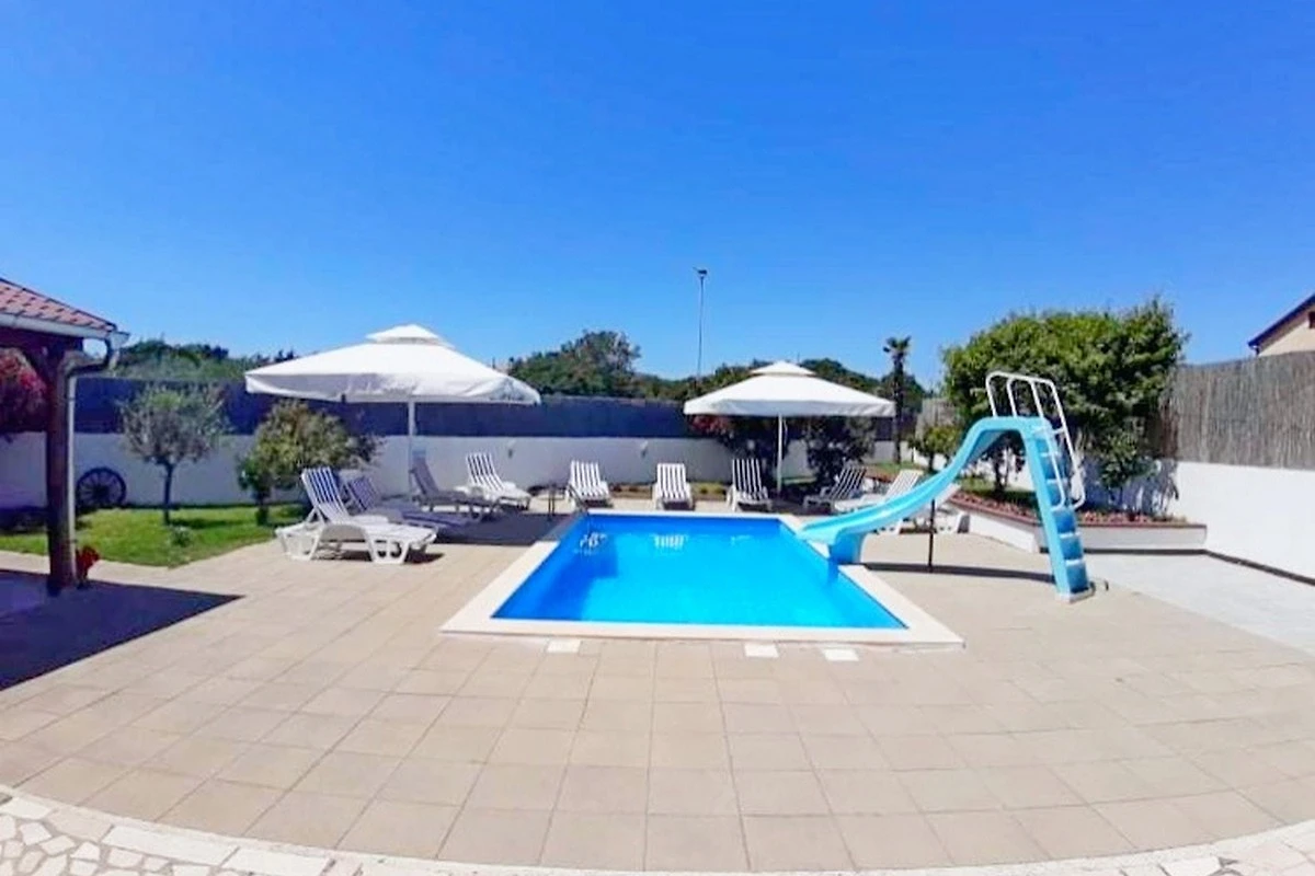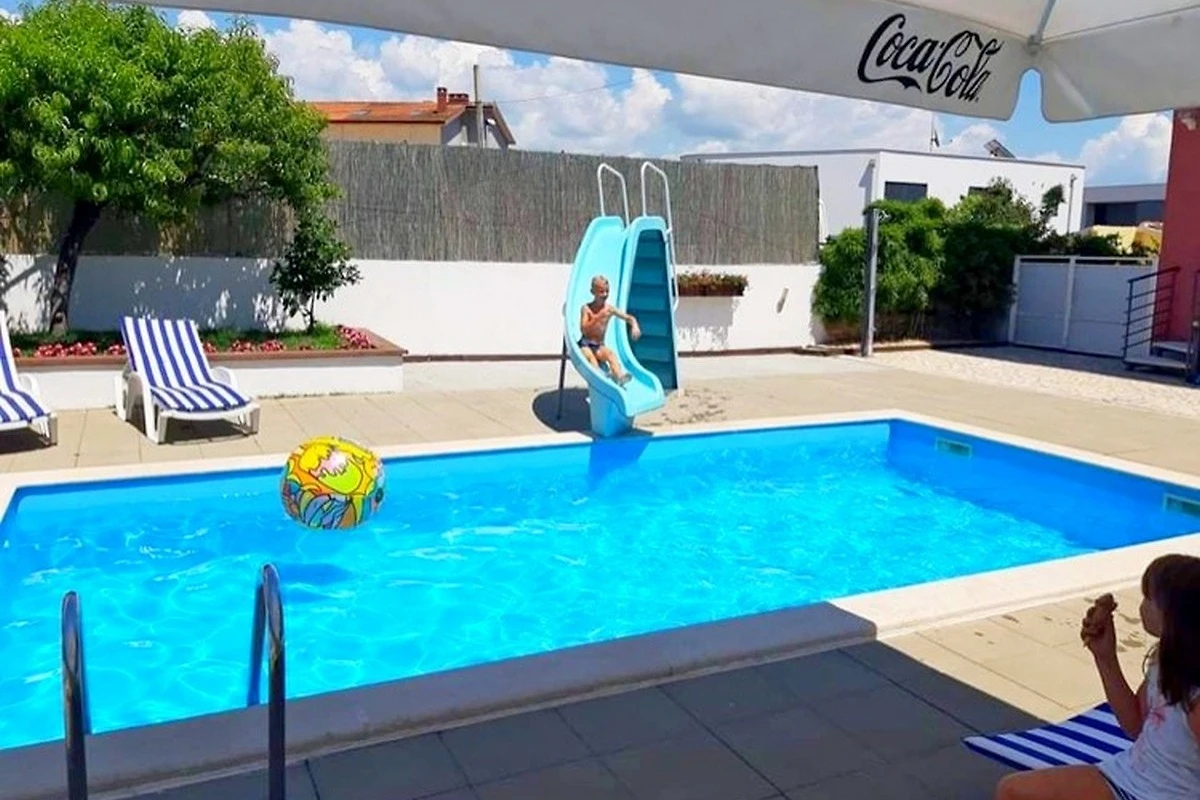 Buiten bevindt zich het 24m² privézwembad, omgeven door ligstoelen en een parasol.