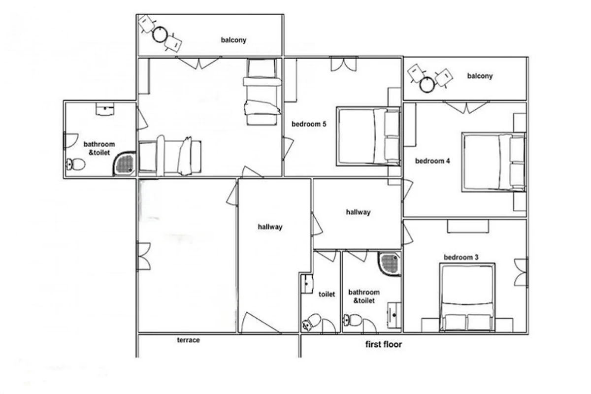 Op de eerste verdieping bevinden zich de vier overige slaapkamers en de twee overige badkamers (dezelfde uitrusting als op de benedenverdieping).