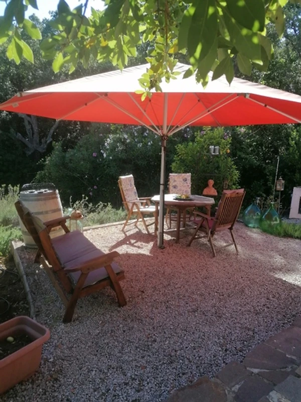 De twee televisies werden daarom alleen gebruikt om snel te zien wat er in de wereld gebeurde – en al snel waren we weer terug in de prachtige tuin of op het schaduwrijke terras. Er was altijd wel iets te horen of te zien buiten, en op het liefdevol ingerichte terras zit je altijd beschermd tegen regen of zon. Direct voor de deur konden we met onze hond het bos vol kurkeiken, varens... binnengaan en lange wandelingen maken in de schaduwrijke groene omgeving.
