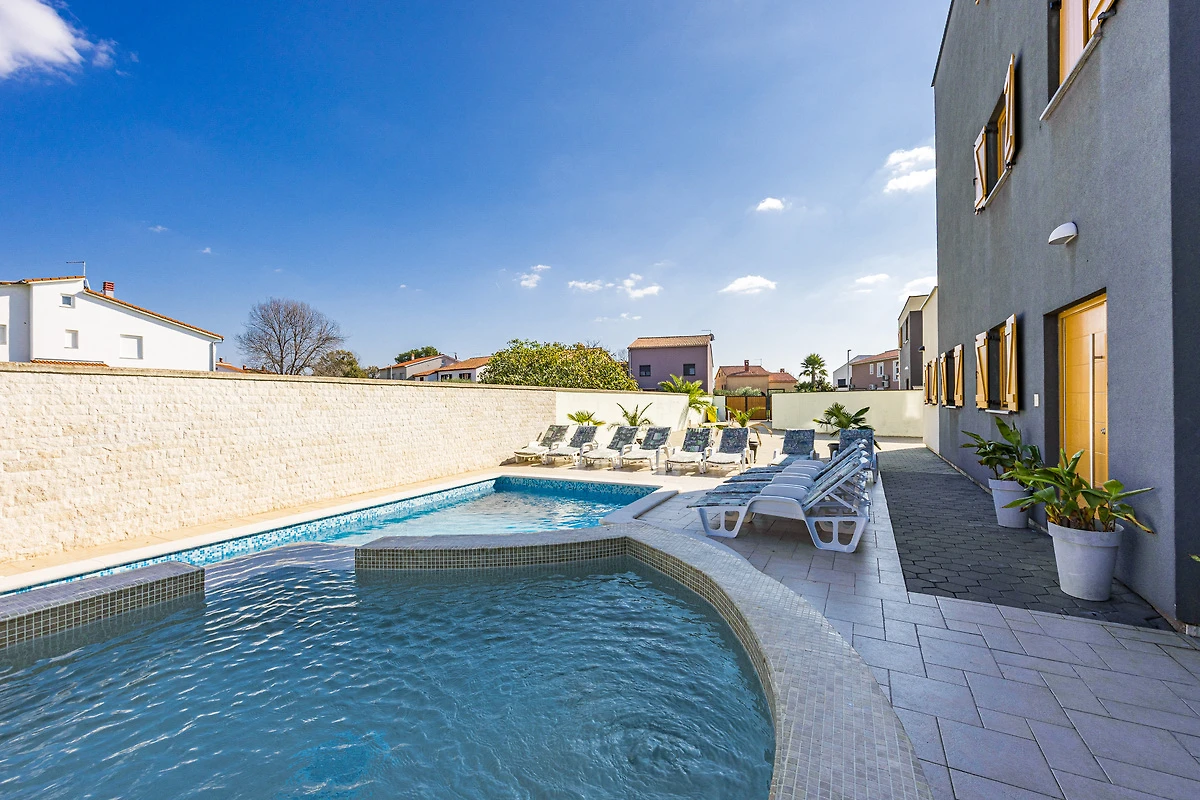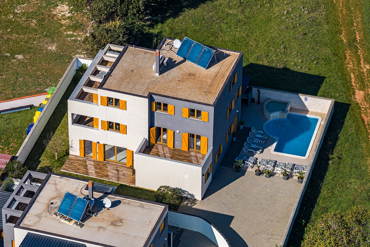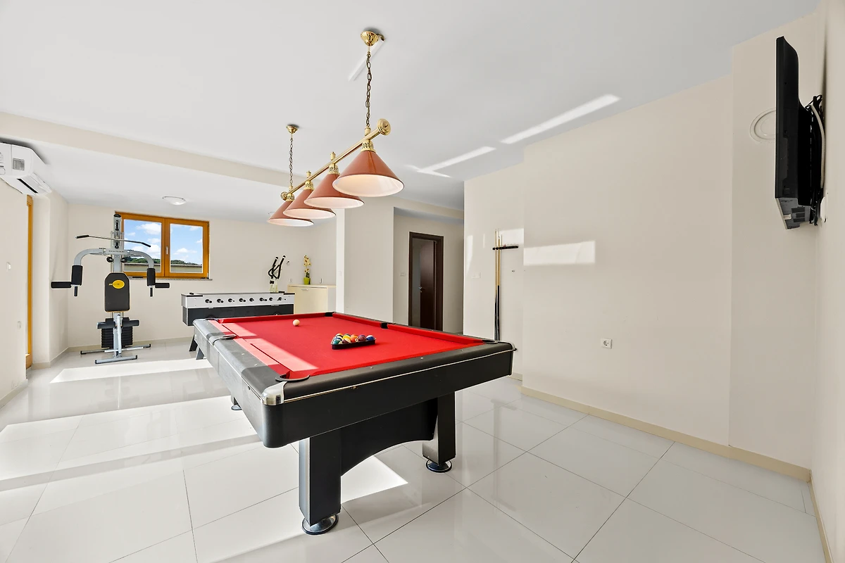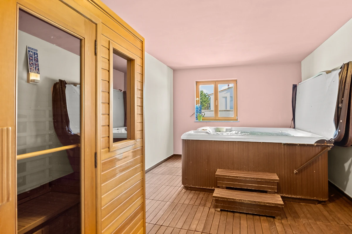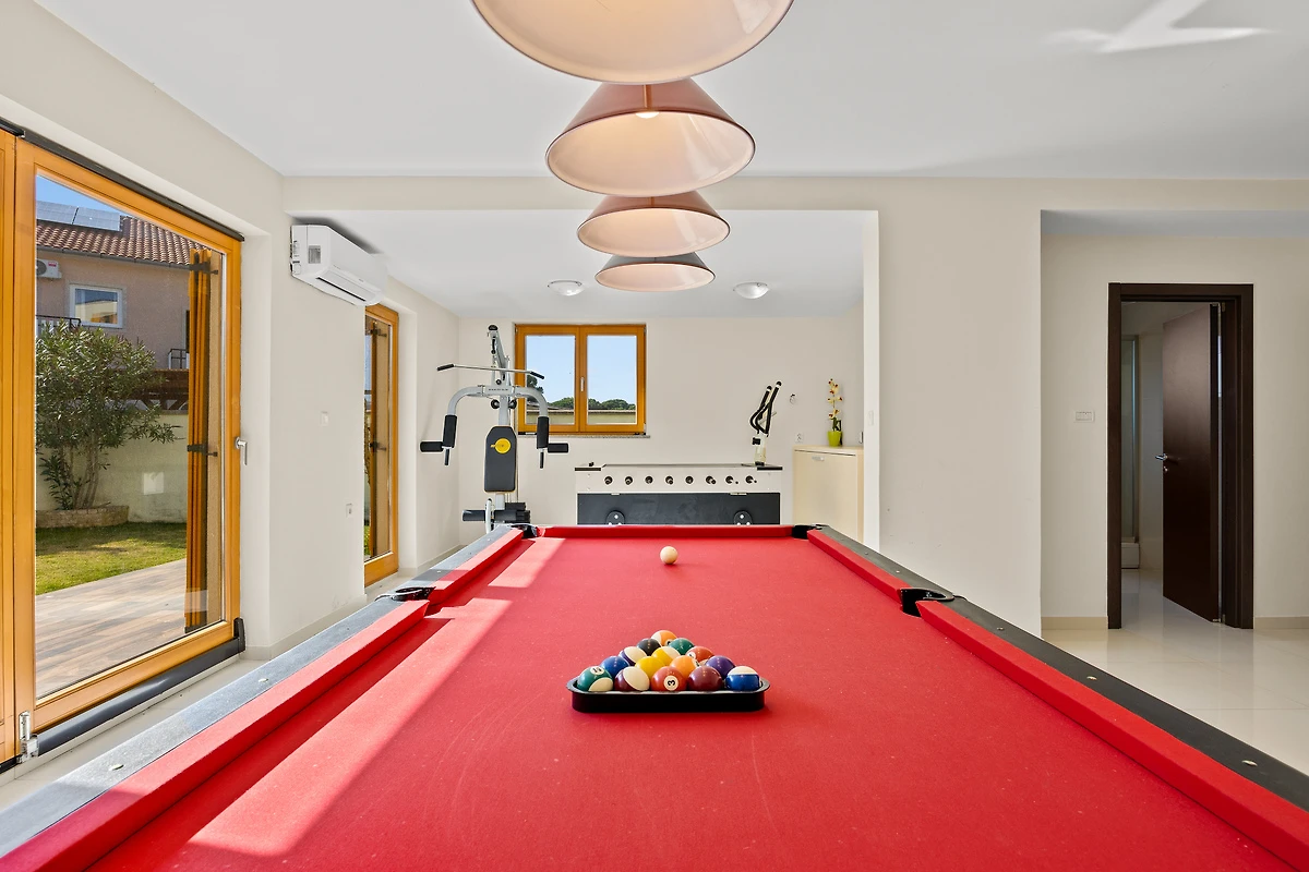 De villa is gelegen in een rustig deel van Valbandon, op 800 meter van de zee en het strand. Het is omgeven door 6 tweepersoonskamers en 1 eenpersoonskamer en 7 badkamers. Grote woonkamer met twee grote uitschuifbedden. De keuken is goed uitgerust en omvat een grote eetkamer met 14 zitplaatsen. Groot terras met 14 zitplaatsen. Buitenzwembad met extra kinderbad totaal 30m2. Er is airconditioning op elke verdieping. Extra faciliteiten: biljart, tafeltennis, darts, kleine fitnessruimte, tafelvoetbal, grote whirlpool (jacuzzi), sauna, buiten barbecue en een grote tafel met twee. Parkeerplaats voor 4 voertuigen.