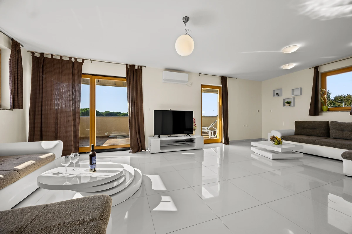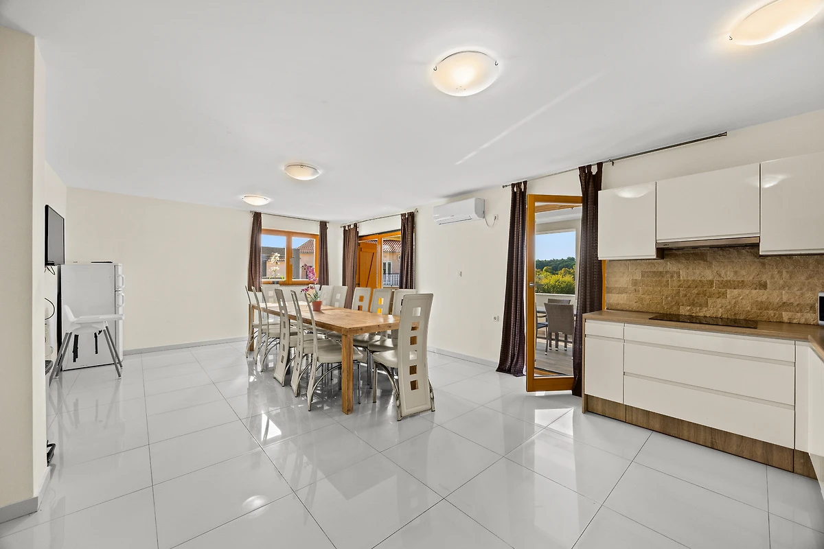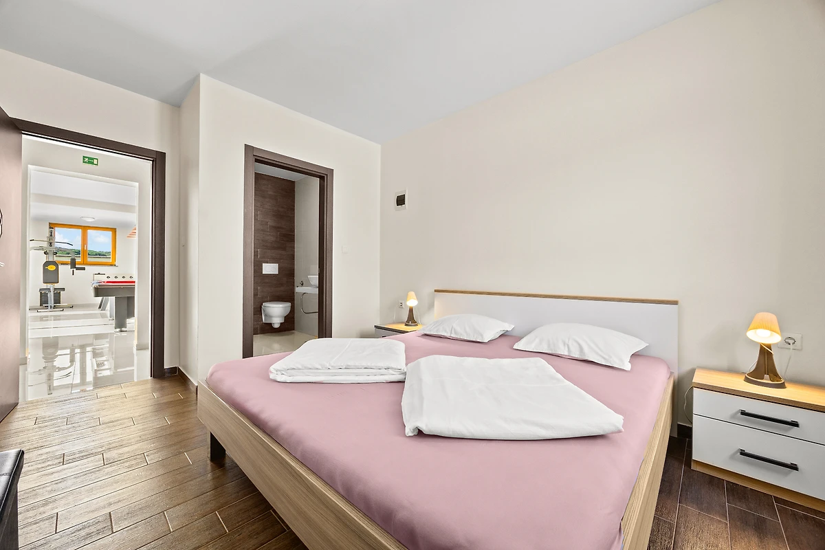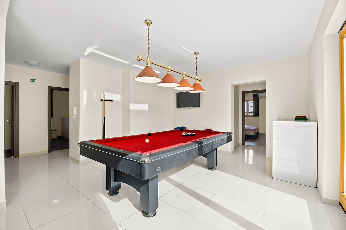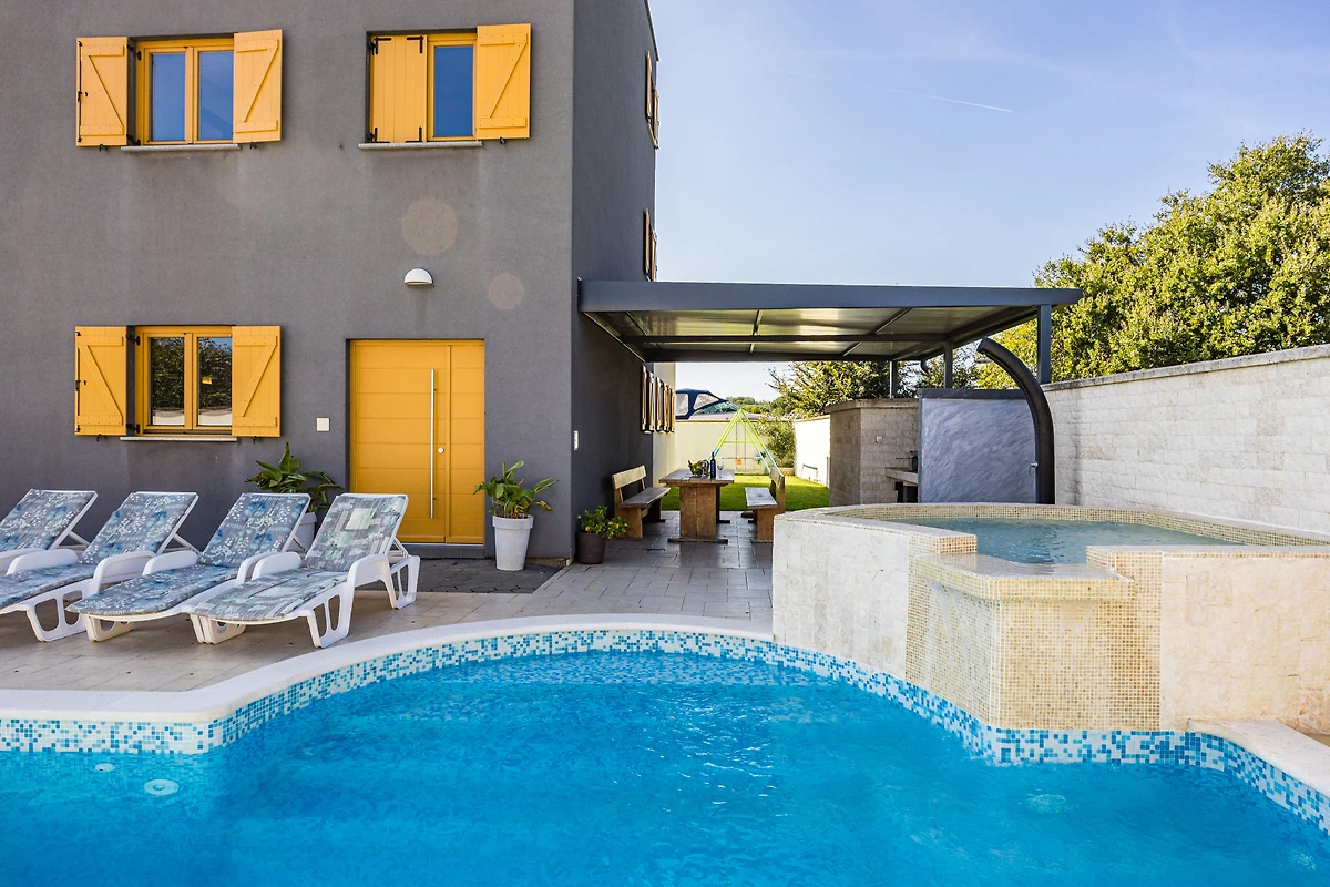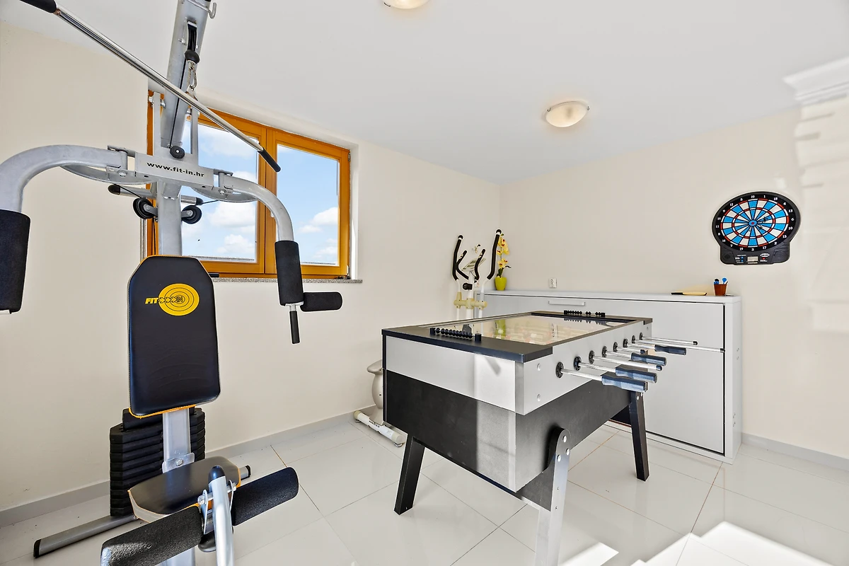 De villa is gelegen in een rustig deel van Valbandon, op 800 meter van de zee en het strand. Het is omgeven door 6 tweepersoonskamers en 1 eenpersoonskamer en 7 badkamers. Grote woonkamer met twee grote uitschuifbedden. De keuken is goed uitgerust en omvat een grote eetkamer met 14 zitplaatsen. Groot terras met 14 zitplaatsen. Buitenzwembad met extra kinderbad totaal 30m2. Er is airconditioning op elke verdieping. Extra faciliteiten: biljart, tafeltennis, darts, kleine fitnessruimte, tafelvoetbal, grote whirlpool (jacuzzi), sauna, buiten barbecue en een grote tafel met twee. Parkeerplaats voor 4 voertuigen.