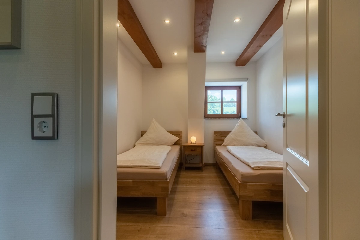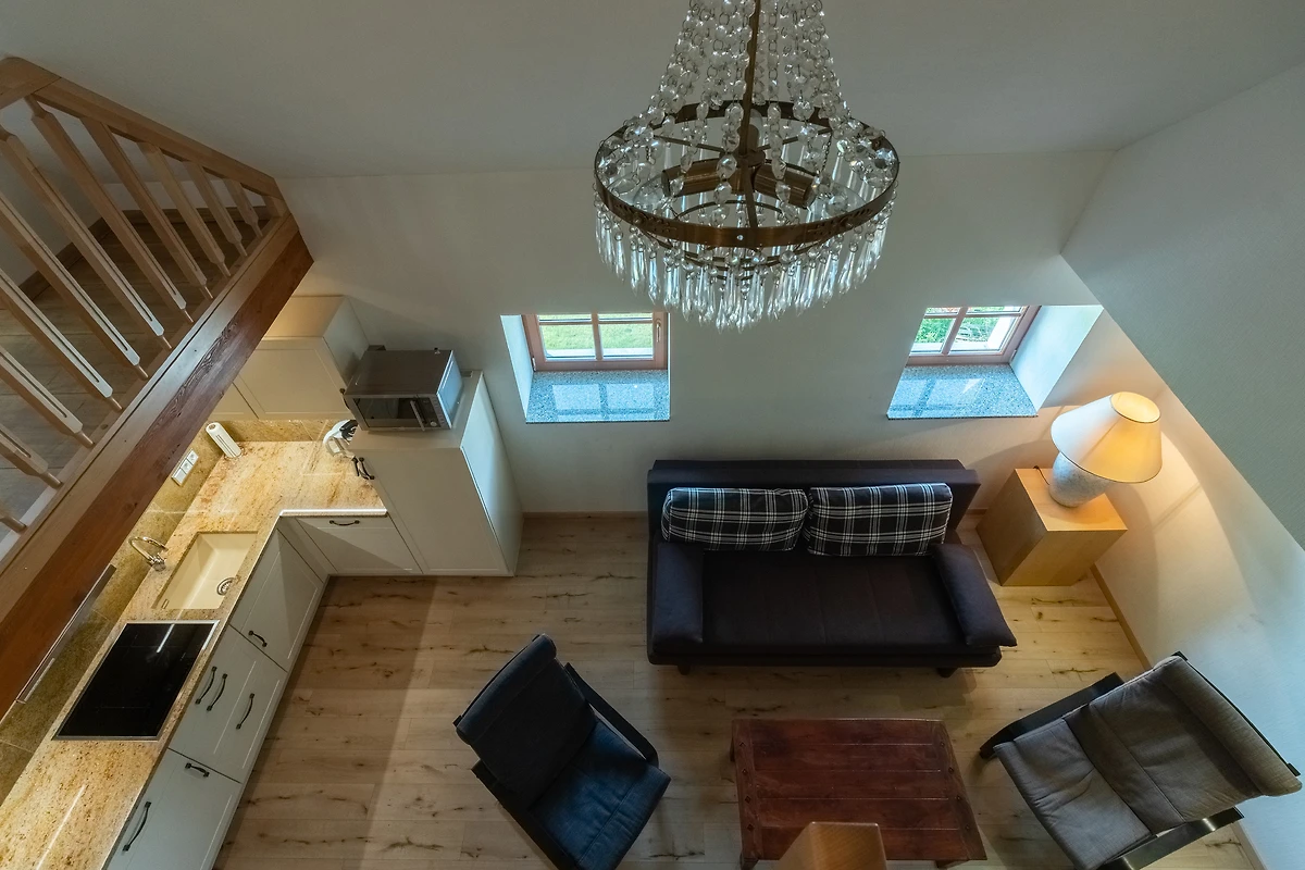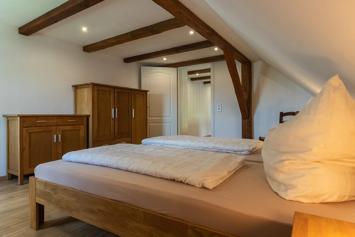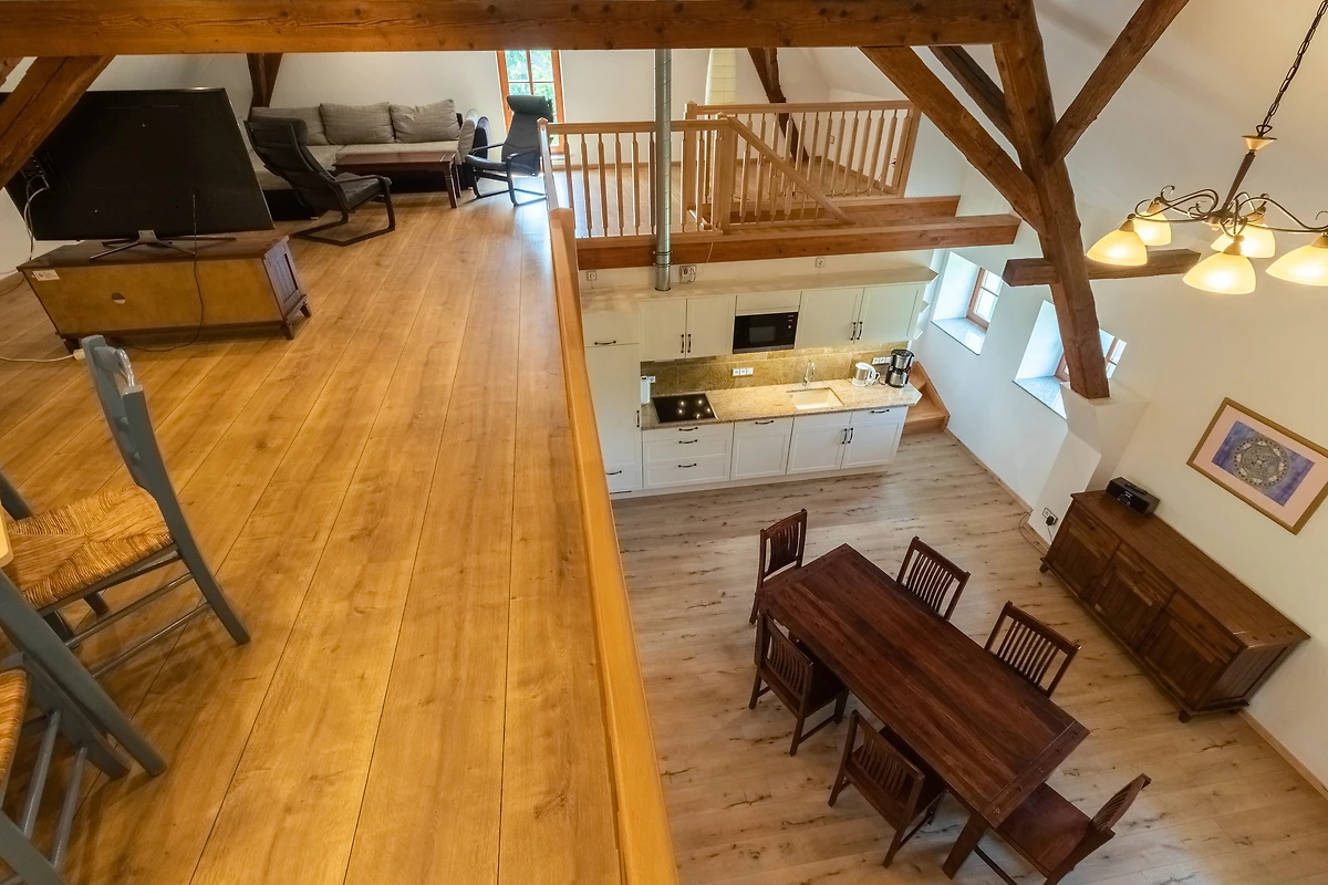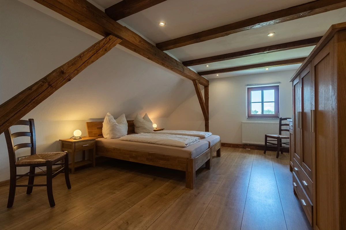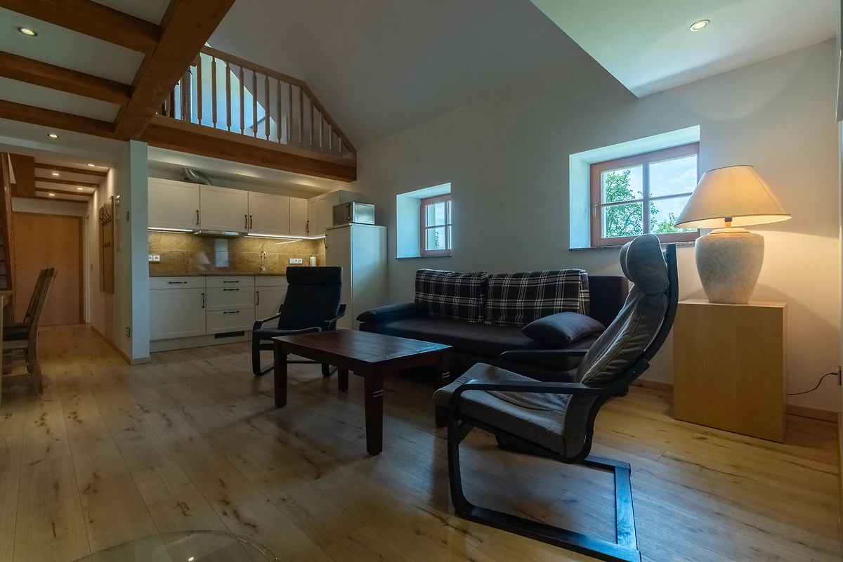 Achter de ruwbouw van een als koetshuis en opslagplaats gebruikte schuur, die naar historisch voorbeeld werd gerenoveerd, werden 3 afzonderlijke vakantiewoningen in maisonnettestijl ontworpen als nieuwe inrichting. Ze beginnen elk op de eerste verdieping en reiken tot in het dakgedeelte, waar de oorspronkelijke balken zichtbaar zijn gelaten. Er is keuze uit twee verschillend ontworpen flat types