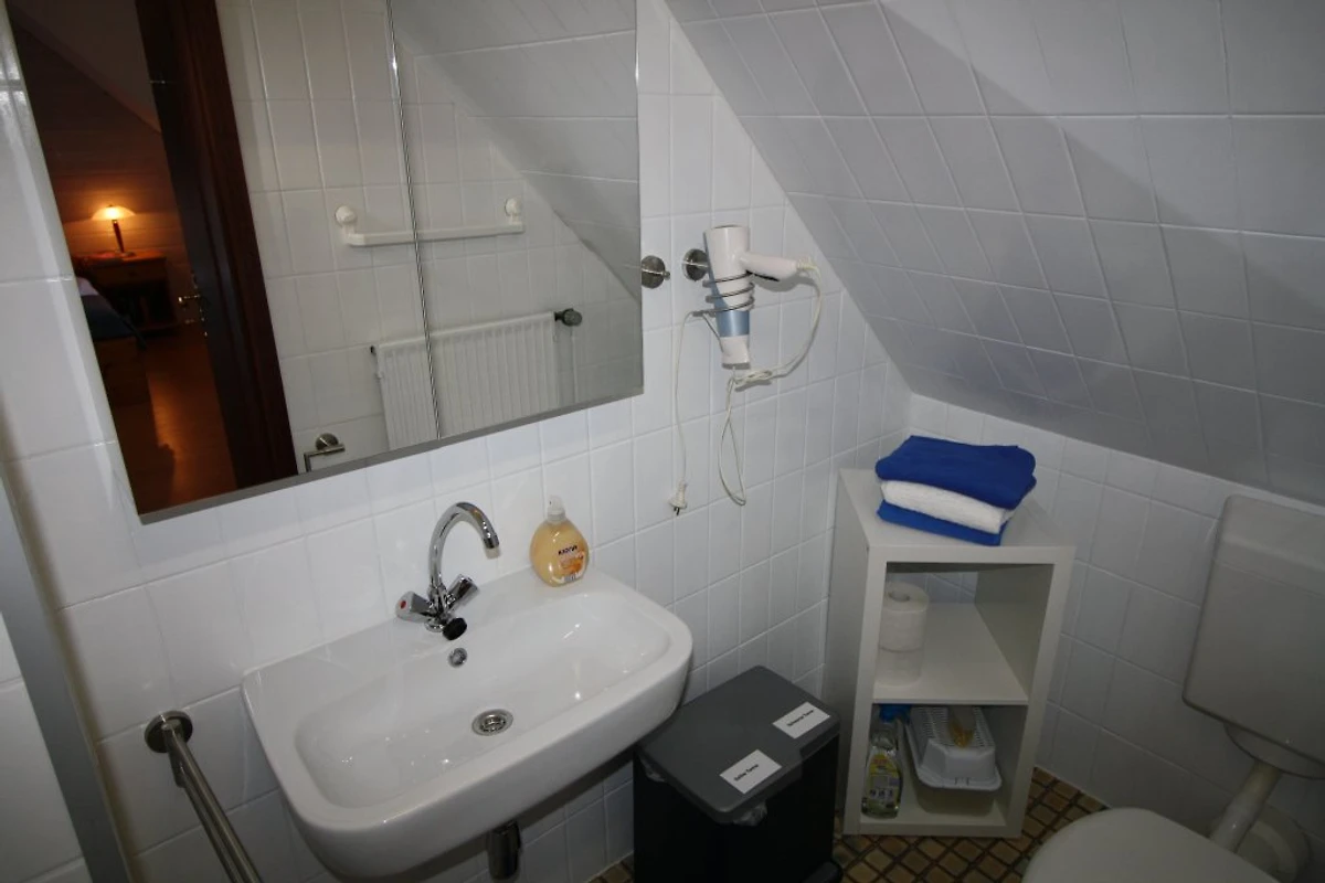 De vakantiewoning "Neßmersiel" bevindt zich op de bovenste verdieping. Op 18 m² is er alles wat je nodig hebt voor een leuke vakantie. Er is een woon-slaapkamer met 2 eenpersoonsbedden, evenals een kleine kitchenette met koelkast, kookplaat, magnetron en Senseo koffiezetapparaat. Natuurlijk is er ook een televisie en radio. Er is een badkamer met douche en WC. In onze tuin heb je de mogelijkheid om te relaxen of gebruik te maken van onze barbecue. Er is een bergruimte voor je fietsen met e-bike oplaadpunten, de gastenparkeerplaatsen bevinden zich direct voor het huis en zijn gratis.