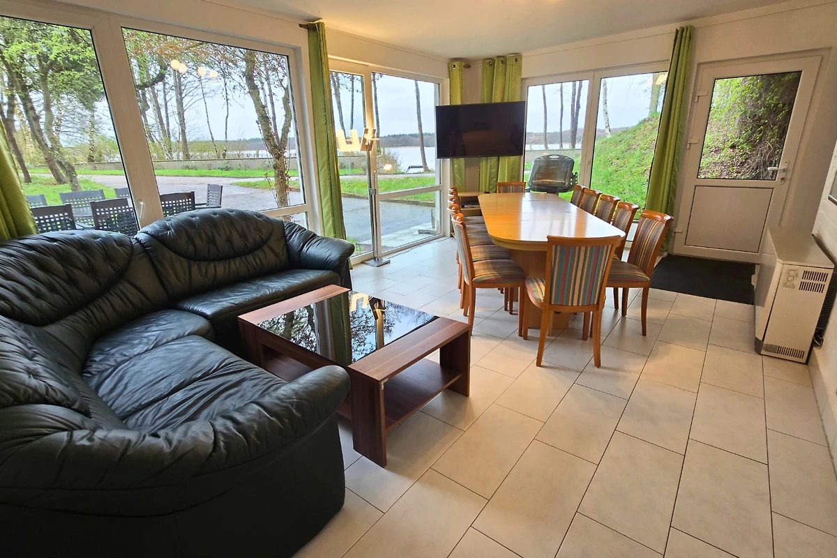 Het vakantiehuis heeft een terras, tuin, woonkamer-wintertuin, hal, keuken, 4 slaapkamers, 2 badkamers met douche en toilet (1 badkamer is geschikt voor rolstoelgebruikers). Op het terras staan 12 stoelen, 2 tafels, 1 parasol en 1 barbecue. In de woonkamer-wintertuin staat 1 eettafel met 12 stoelen, 1 hoekbank en 1 fauteuil. Het wordt overspoeld met licht en de panoramische ramen kijken uit op het oosten en het zuiden. Het uitzicht op het meer wordt omlijst door veel groen. Aan de muur hangt een 55 inch LED TV. Schoenen en jassen vinden een plek in de gang, van waaruit je de keuken binnenkomt. De ingerichte keuken heeft een vaatwasser, 4-pits keramische kookplaat, oven, magnetron, waterkoker, broodrooster, koffiezetapparaat en alle kookgerei, glazen en serviesgoed. Een grote side-by-side koelkast staat klaar om gevuld te worden. De doucheruimte bestaat uit een wastafel, WC en ronde douche. De badkamer heeft een inloopdouche, wastafel en WC. Slaapkamer 1, 3 en 4 hebben elk 1 tweepersoonsbed + 1 stapelbed, nachtkastjes en 1 kledingkast. Slaapkamer nr. 2 heeft 1 tweepersoonsbed + 1 eenpersoonsbed, nachtkastjes en 1 kledingkast. Slaapkamer 2, 3 en 4 hebben een LED TV.