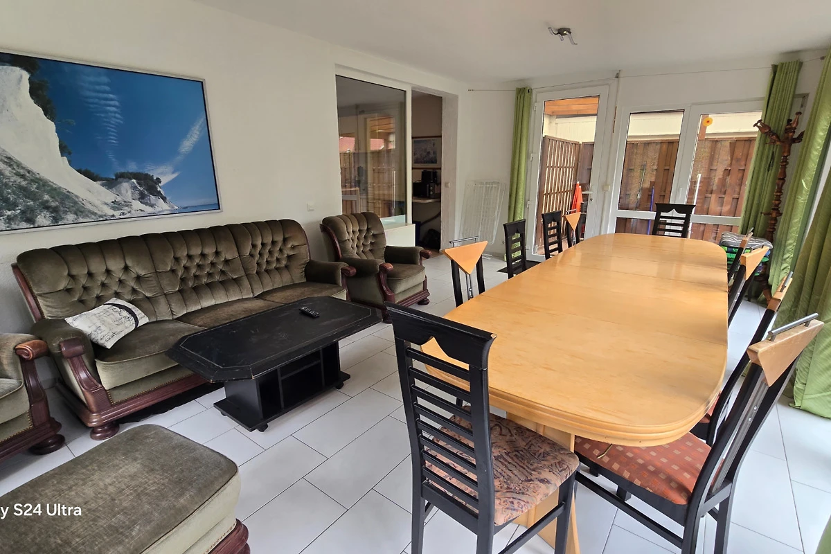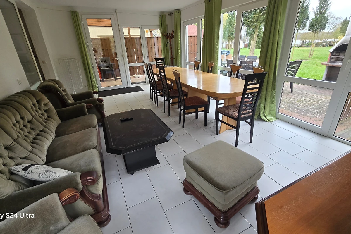 In de serre woonkamer staan een 3-zitsbank, 2 fauteuils, een dressoir, een grote 55" flat screen LED satelliet TV, 2 eettafels met 12 stoelen en een CD speler - radio.