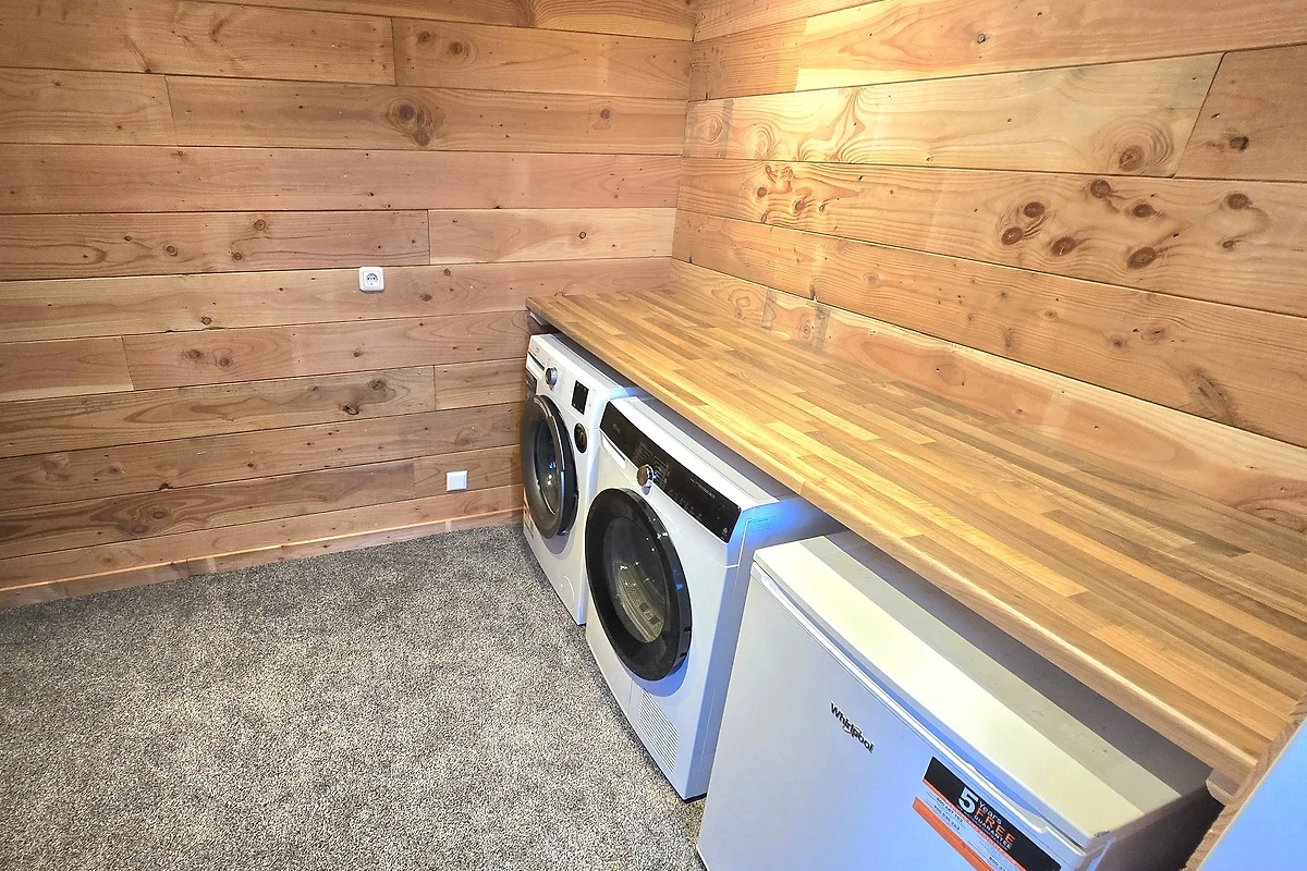 Diepvries, stofzuiger, wasmachine, droger en droogrek aanwezig.