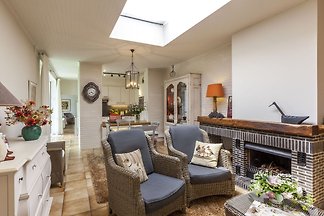 Parterre: (woonkamer(TV(smart TV), eettafel, open haard, zithoek), open keuken(waterkoker, fornuis, koffiezetapparaat(pads), oven, afwasmachine, koel-/vriescombinatie)