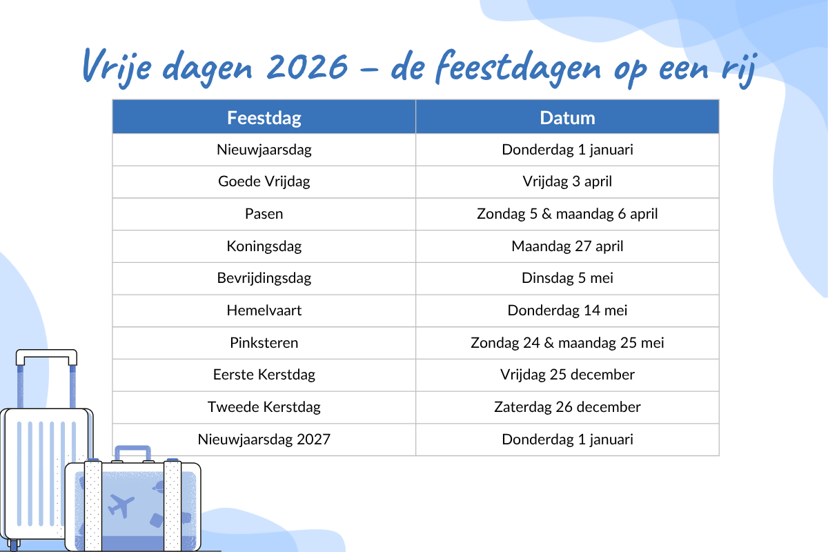 Let op: niet iedereen is standaard vrij op feestdagen zoals Goede Vrijdag of Tweede Kerstdag. Controleer dus eerst goed bij je werkgever op welke dagen je vrij bent.