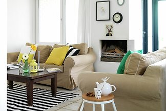 Op de 1e etage: (woonkamer(2-pers. slaapbank, open haard, balkon), open keuken(magnetron, afwasmachine), slaapkamer(2-pers. bed), badkamer(stoomdouche, wastafel, toilet))