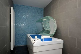 Kitchenette(kookplaat, combimagnetron, afwasmachine), woon/slaapkamer(2-pers. slaapbank, stapelbed), badkamer(bad of douche, wastafel, toilet), balkon of terras, tuinmeubilair