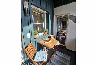 Op de 1e etage: (keuken(fornuis(keramisch), oven, magnetron, afwasmachine, koel-/vriescombinatie), woon/slaapkamer(1-pers. bed, TV(satelliet), balkon), slaapkamer(2-pers. bed)