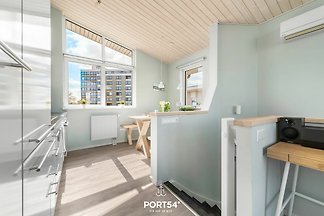 Moderne flat (nieuw!) met groot balkon en panoramisch uitzicht op de Oostzee, fjord en jachthaven, snelle gratis WiFi, bio-open haard, regendouche, overspoeld met licht en helder ☀️